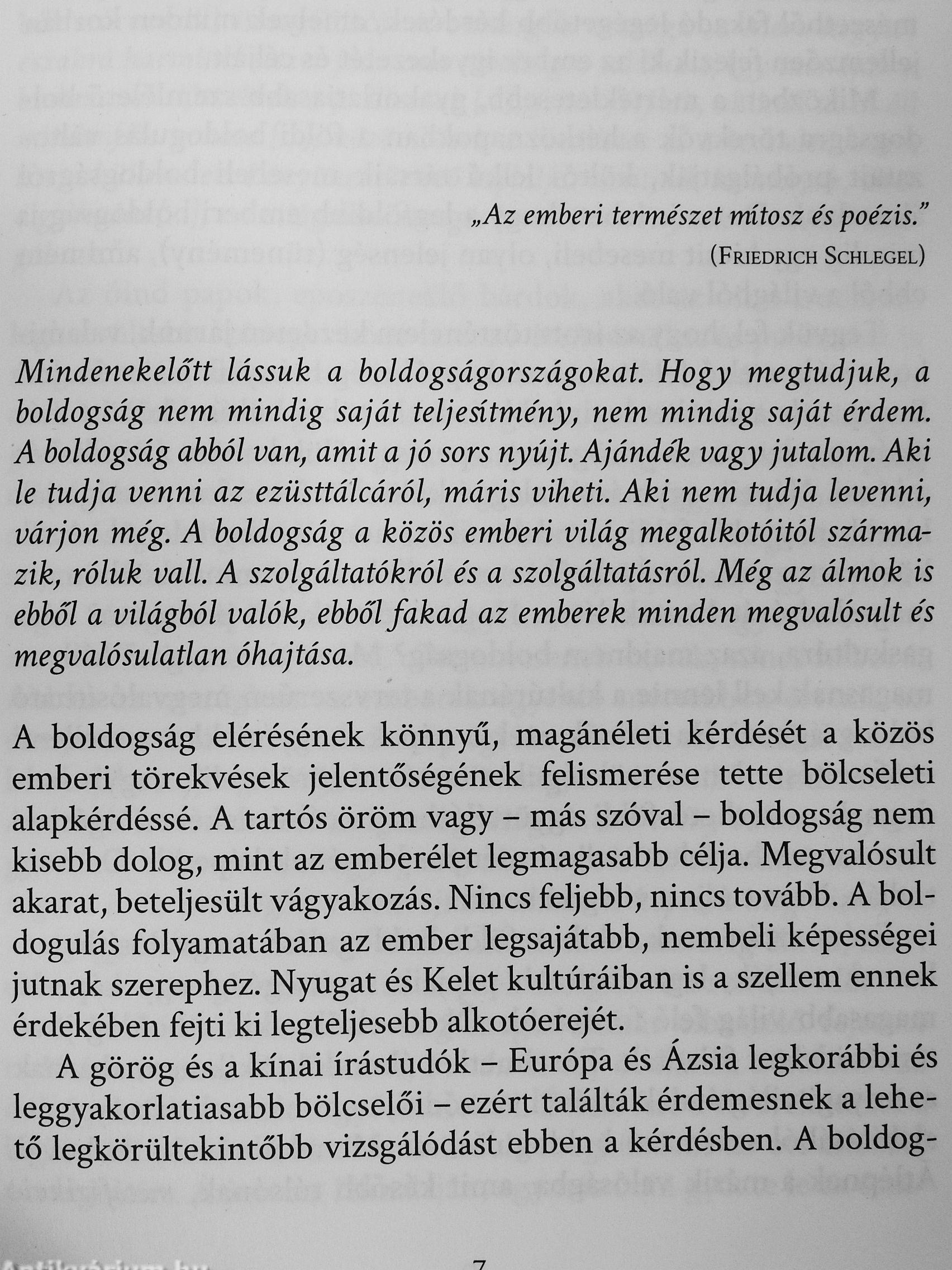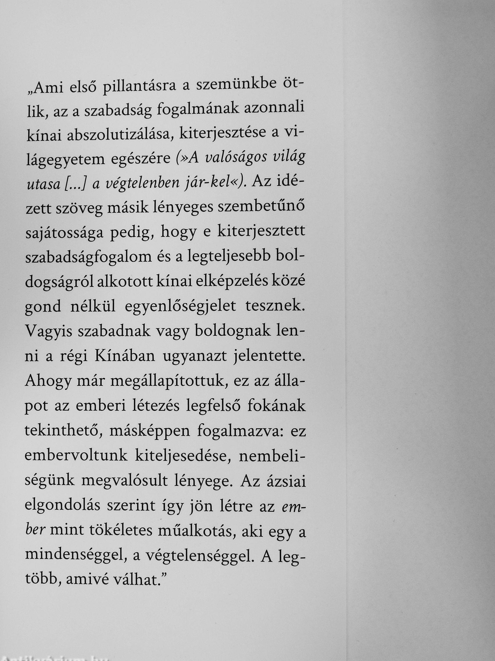 „Ami első pillantásra a szemünkbe ötlik, az a szabadság fogalmának azonnali kínai abszolutizálása, kiterjesztése a világegyetem egészére (»A valóságos világ utasa [ ] a végtelenben jár-kel«). Az idézett szöveg másik lényeges szembetűnő sajátossága pedig, hogy e kiterjesztett szabadságfogalom és a legteljesebb boldogságról alkotott kínai elképzelés közé gond nélkül egyenlőségjelet tesznek. Vagyis szabadnak vagy boldognak lenni a régi Kínában ugyanazt jelentette. Ahogy már megállapítottuk, ez az állapot az emberi létezés legfelső fokának tekinthető, másképpen fogalmazva: ez embervoltunk kiteljesedése, nembeli-ségünk megvalósult lényege. Az ázsiai elgondolás szerint így jön létre az ember mint tökéletes műalkotás, aki egy a mindenséggel, a végtelenséggel. A legtöbb, amivé válhat."