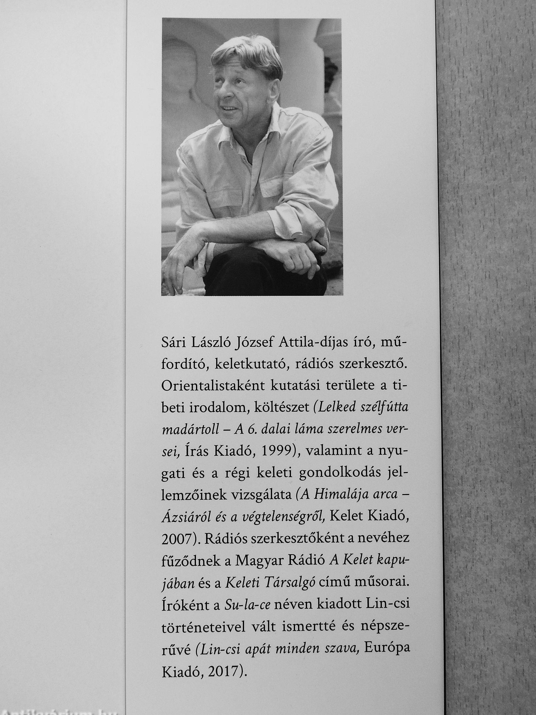 Sári László József Attila-díjas író, műfordító, keletkutató, rádiós szerkesztő. Orientalistaként kutatási területe a tibeti irodalom, költészet (Lelked szélfútta madártoll ~A6. dalai láma szerelmes versei,...
