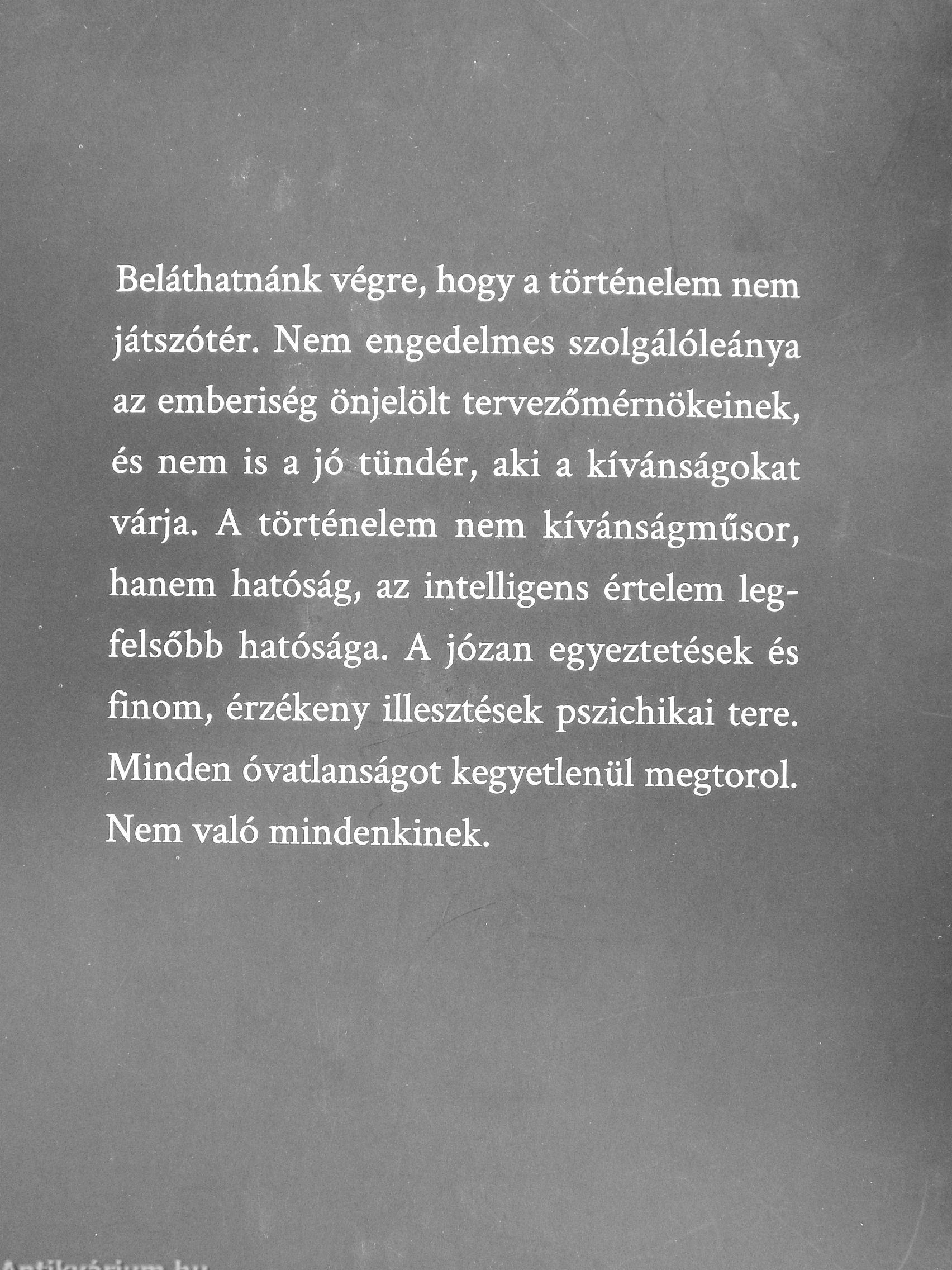 Beláthatnánk végre, hogy a történelem nem játszótér. Nem engedelmes szolgálóleánya az emberiség önjelölt tervezőmérnökeinek, és nem is a jó tündér, aki a kívánságokat várja. A történelem nem kívánságműsor, hanem hatóság, az intelligens értelem legfelsőbb hatósága. A józan egyeztetések és finom, érzékeny illesztések pszichikai tere. Minden óvatlanságot kegyetlenül megtorol. Nem való mindenkinek.