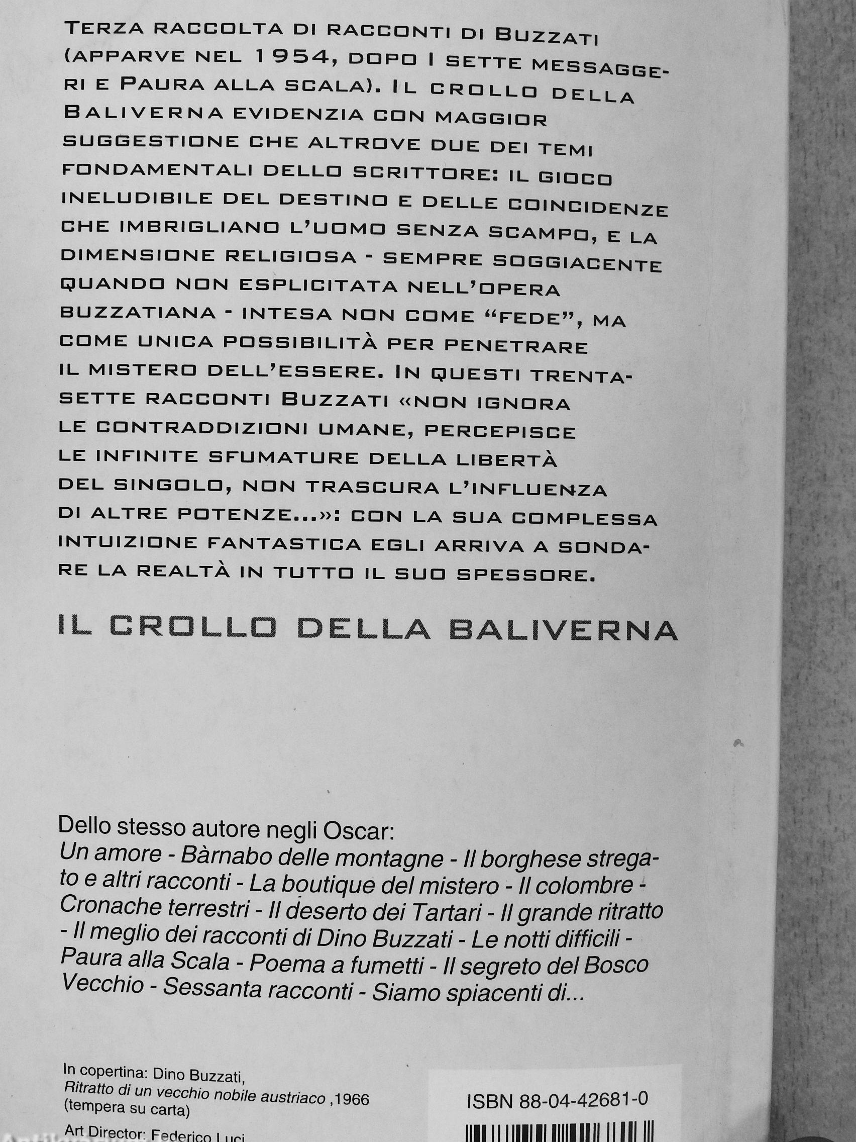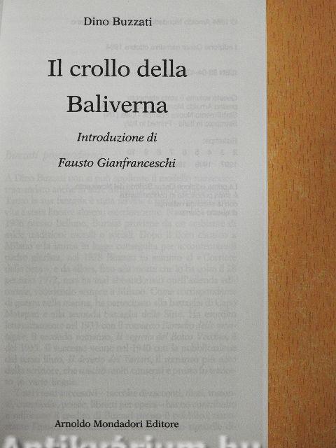 (apparve nel 1 954, dqpd i sette mesbagge-rl e paura alla scala). il crolld della baliverna evidenzia cdn maggior suggestione che altrdve due dei temi fdndamentali dellq scrittdre: il giqcd ineludibile del destino e delle cdincidenze che imbrigliand l^uomd senza scampd, e la dimensidne religiosa - sempre sdggiacente quando non esplicitata nell'opera buzzatiana - intesa non come "fede", ma come unica possibilita per penetrare il mistero dell'essere- in questi trenta-sette racconti buzzati «non ignora le contraddizioni umane, percepisce le infinite sfumature della liberta del singolo, non trascura lmnfluenza di altre potenze--.»: con la sua complessa intuizione fantastica egli arriva a sondare la realta in tutto il suo spessore.