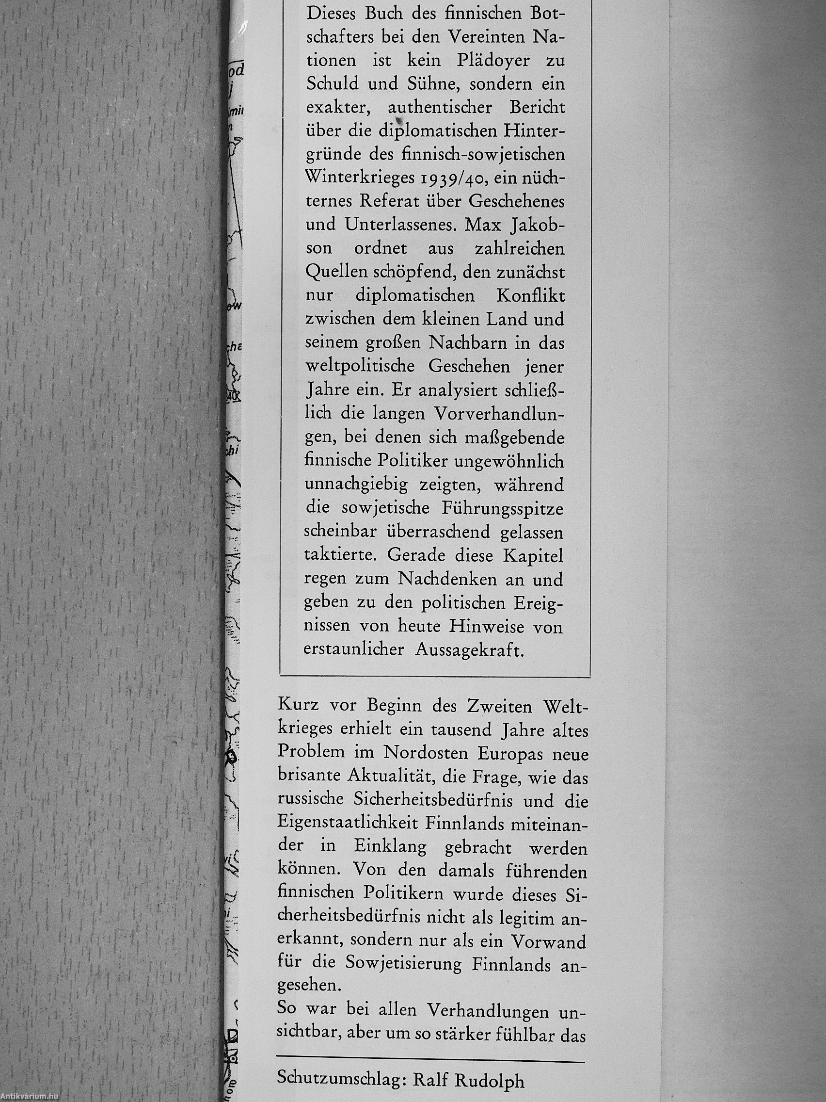 Dieses Buch des finnischen Botschafters bei den Vereinten Nationen ist kein Plädoyer zu Schuld und Sühne, sondern ein exakter, authentischer Bericht über die diplomatischen Hintergründe des finnisch-sowjetischen Winterkrieges 1939/40, ein nüchternes Referat über Geschehenes und Unterlassenes. Max Jakobson ordnet aus zahlreichen Quellen schöpfend, den zunächst nur diplomatischen Konflikt zwischen dem kleinen Land und seinem großen Nachbarn in das weltpolitische Geschehen jener Jahre ein. Er analysiert schließlich die langen Vorverhandlungen, bei denen sich maßgebende finnische Politiker ungewöhnlich unnachgiebig zeigten, während die sowjetische Führungsspitze scheinbar überraschend gelassen taktierte. Gerade diese Kapitel regen zum Nachdenken an und geben zu den politischen Ereignissen von heute Hinweise von erstaunlicher Aussagekraft.