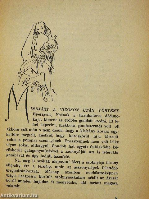 Gondolt hát egyet: feltüzködte köröskörül galagonyatüskével a szoknyáját, azt is telerakta gombával és úgy indult hazafelé. Na, meg is szólták alaposan! Mert a szoknyája bizony alig-alig ért a térdéig, amin az asszonynépek felettébb megbotránkoztak. Másnap azonban csodálatosképpen mégis araszosra kurtult szoknyácskában sétált az Ararát körül minden hajadon és menyecske, aki tartott magára valamit. Vissza