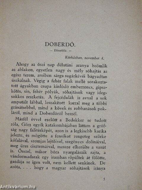 Ahogy az őszi nap délutáni aranya beömlik az ablakon, egyetlen nagy és mély sóhajtás az egész terem, amiben sárga sugárkévéi bágyadtan úszkálnak. Végig a fehér falak mellé sorakoztatott ágyakban csupa kinlódó emberroncs, gipszkötés, sin, fehér pólyák, sóhajtások vagy idegsokkos reszketés. A fejcédulák is avval a sok amputált lábbal, leszakított karral meg a többi gránátsebbel, mind a kövek és robbanások pokláról, mind a Doberdóról beszél.