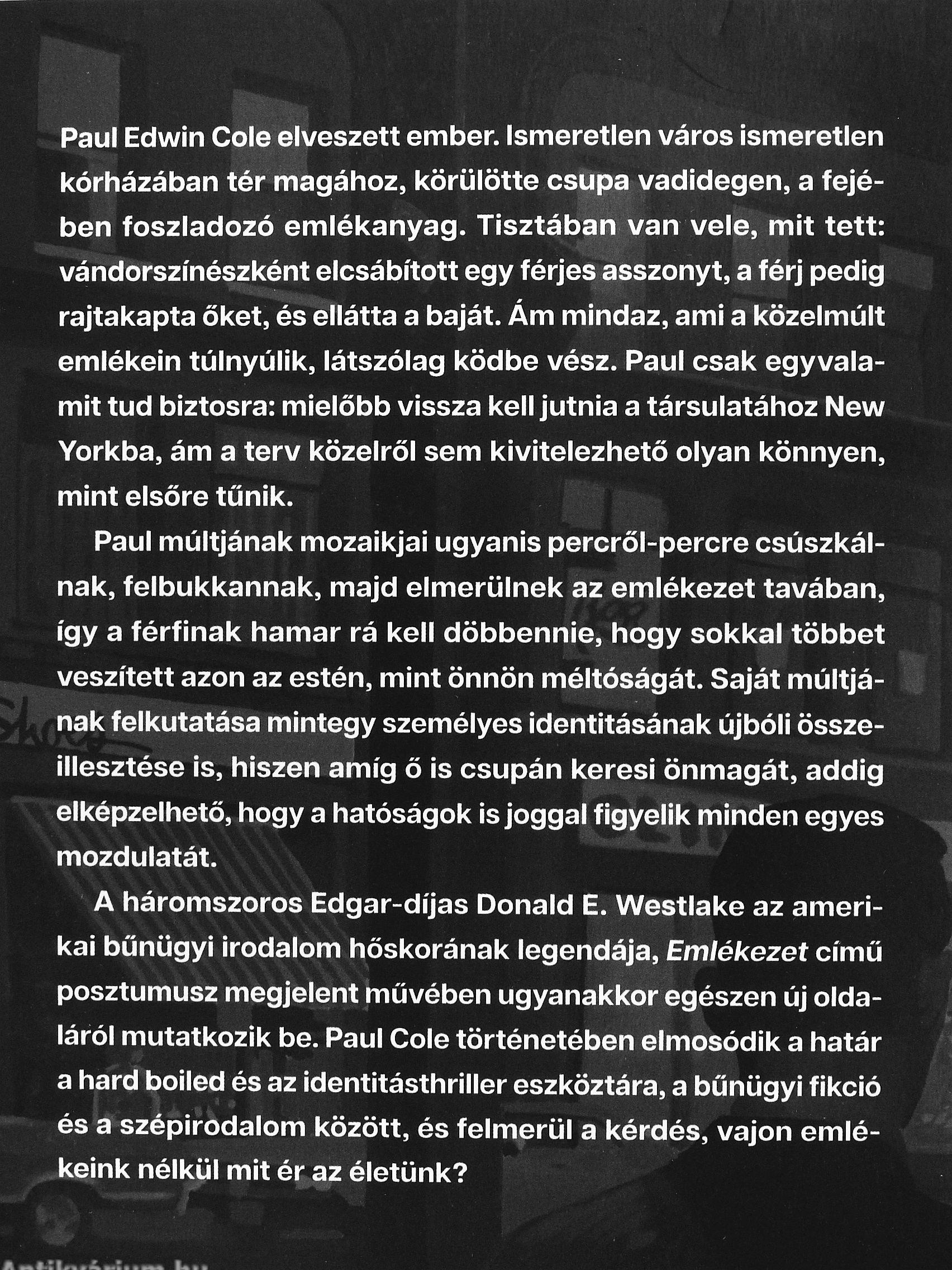 A háromszoros Edgar-díjas Donald E. Westlake az amerikai bűnügyi irodalom hőskorának legendája, Emlékezet című posztumusz megjelent művében ugyanakkor egészen új oldaláról mutatkozik be. Paul Colé történetében elmosódik a határ a hard boiied és az identitásthriller eszköztára, a bűnügyi fikció és a szépirodalom között, és felmerül a kérdés, vajon emlékeink nélkül mit ér az életünk?