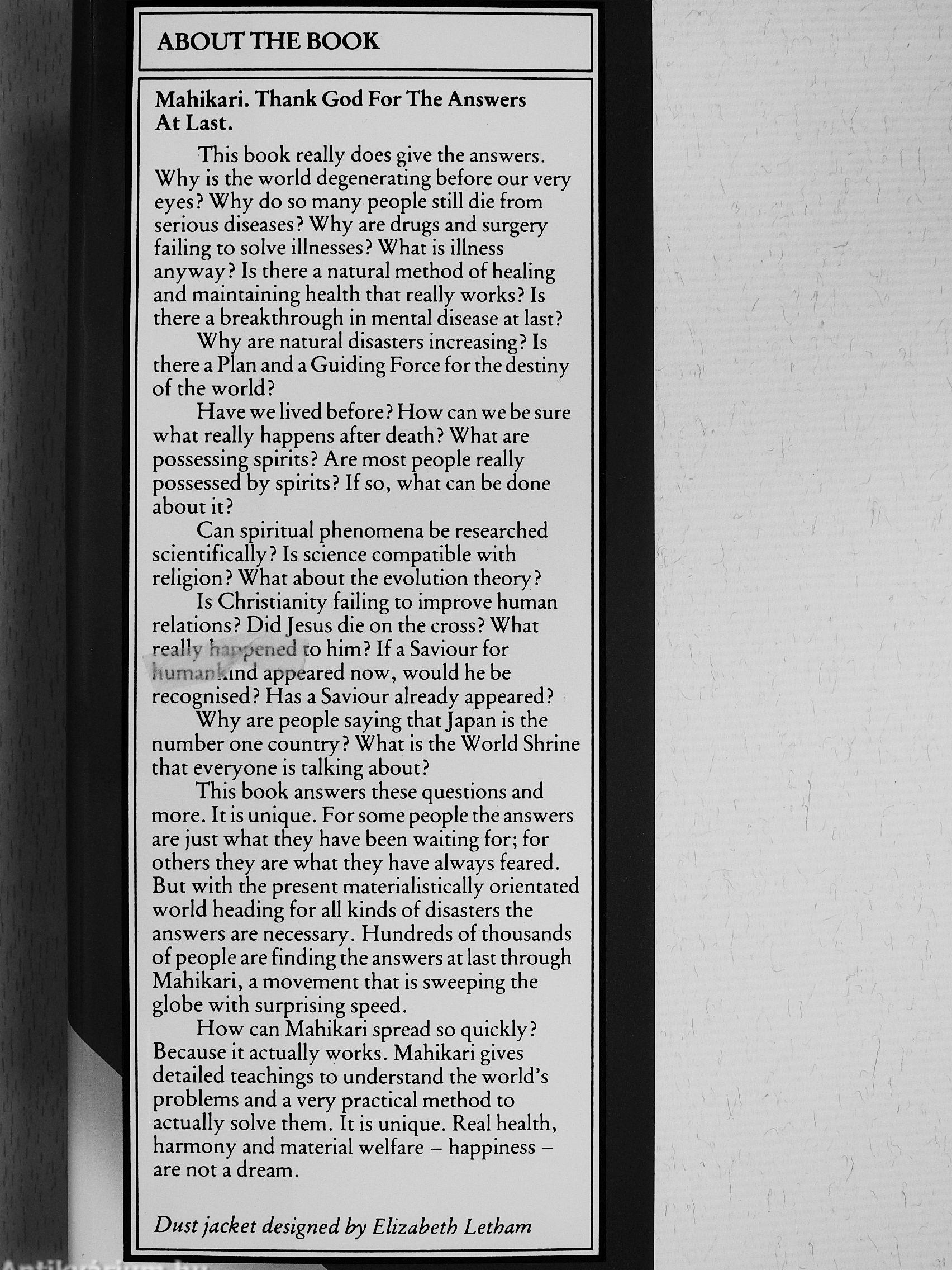 This book answers these questions and more. It is unique. For some people the answers are just what they have been waiting for; for others they are what they have always feared. But with the present materialistically orientated world heading for all kinds of disasters the answers are necessary. Hundreds of thousands of people are finding the answers at last through Mahikari, a movement that is sweeping the globe with surprising speed.