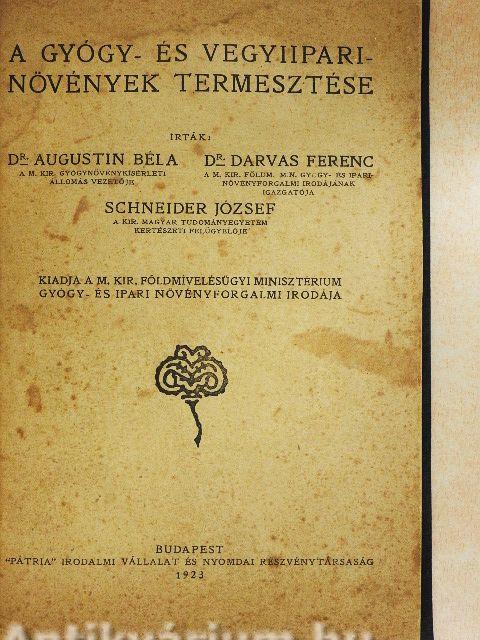Megjegyzés: Nyomtatta a "Pátria" nyomda, Budapest. 54 fekete-fehér ábrával illusztrálva. Írták: Dr. Augustin Béla a M. Kir. Gyógynövénykísérleti Állomás vezetője, Dr. Darvas Ferenc a M. Kir. Földm. M. N. Gyógy- és Iparinövényforgalmi Irodájának igazgatója és Schneider József a Kir. Magyar Tudományegyetem Kertészeti Felügyelője.