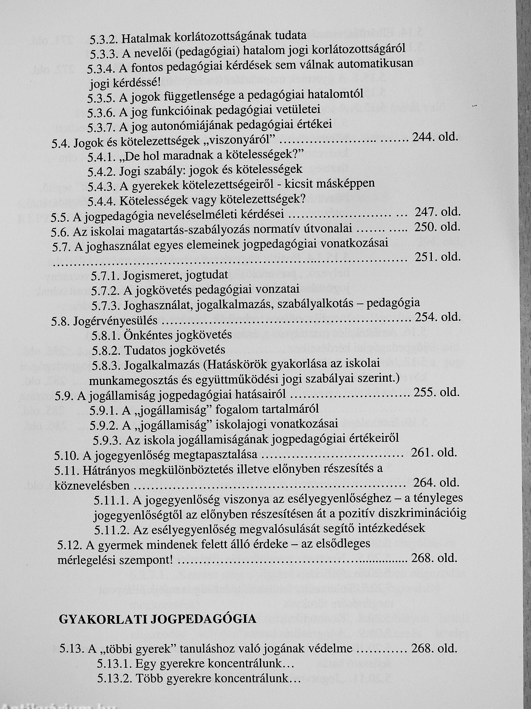 Ezt a komoly vállalást a könyv úgy oldja meg, hogy ismeretterjesztő, leíró és rendszerező jelleggel bemutatja a hatályos köznevelési jogi szabályozásnak a gyerekek, szülők, pedagógusok jogait közvetlenül érintő részét és ennek tipikus jogalkalmazási probléma-jelenségeit. Majd ezeket a leíró részeket kritikai elemzésnek veti alá a jogok tényleges érvényesülése szempontjából. A jogérvényesülés vizsgálata és értékelése teszi lehetővé a jogpedagógiai hatások megfogalmazását.