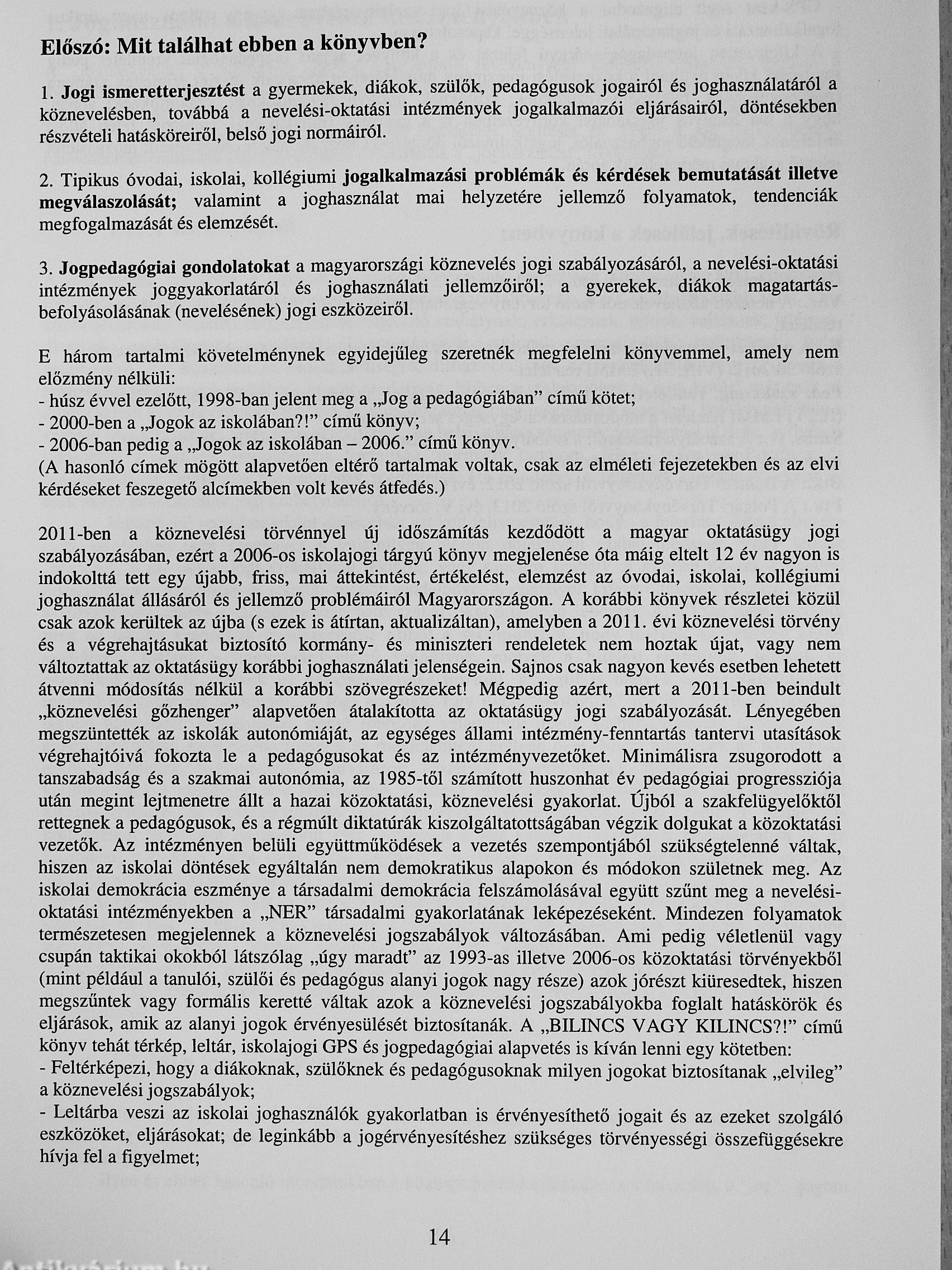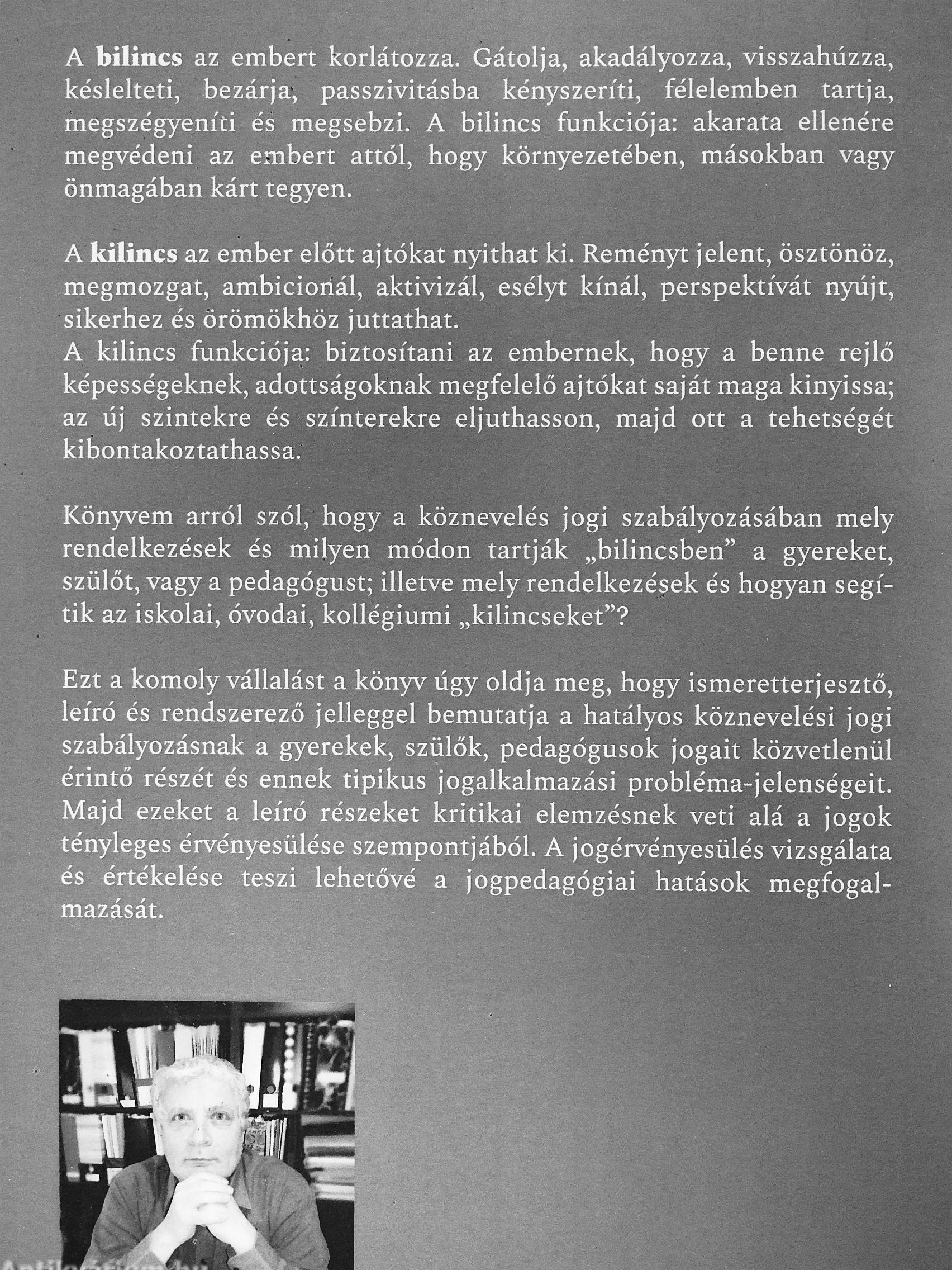 Könyvem arról szól, hogy a köznevelés jogi szabályozásában mely rendelkezések és milyen módon tartják „bilincsben" a gyereket, szülőt, vagy a pedagógust; illetve mely rendelkezések és hogyan segítik az iskolai, óvodai, kollégiumi „kilincseket"?