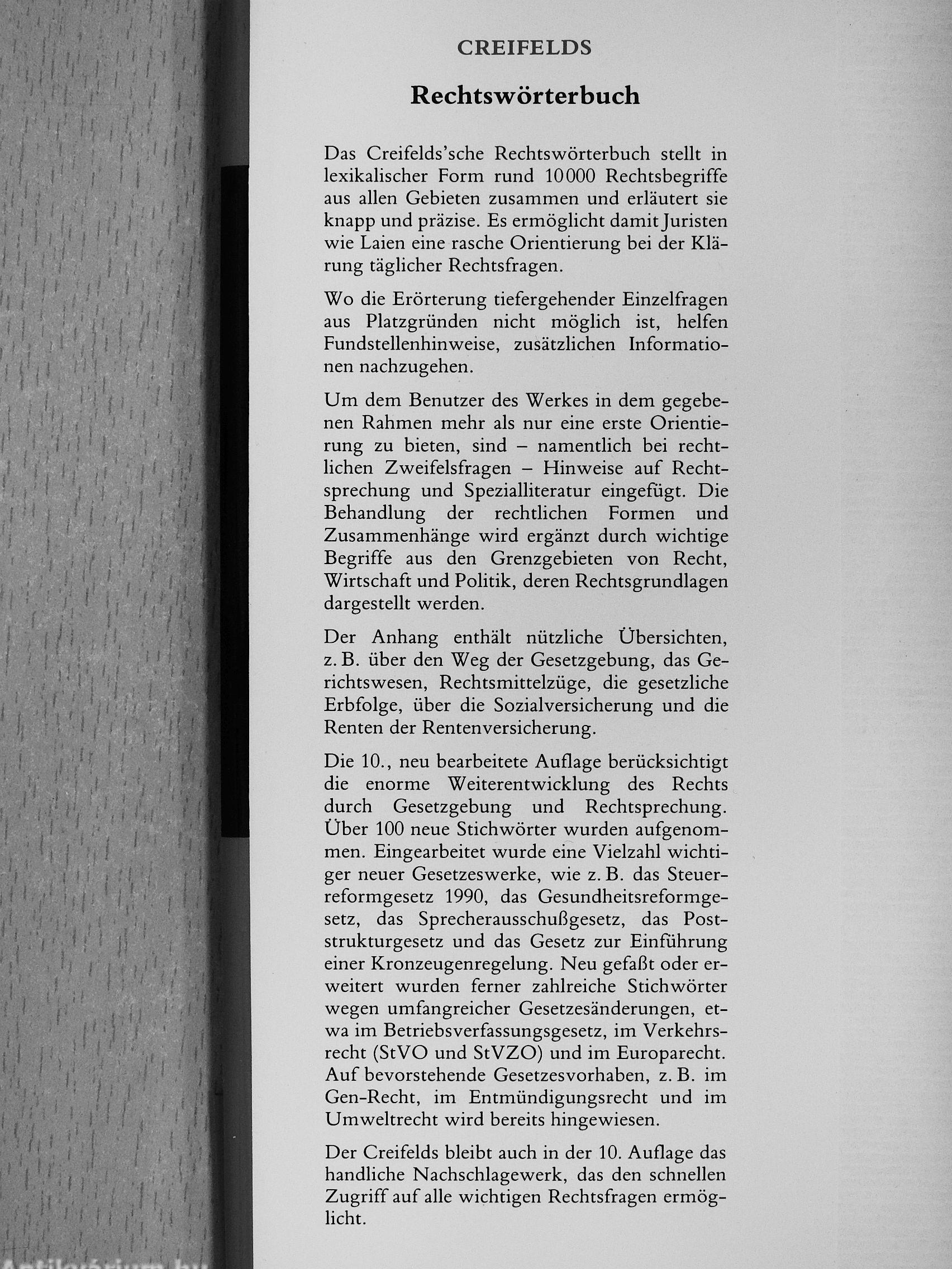 Der Creifelds bleibt auch in der 10. Auflage das handliche Nachschlagewerk, das den schnellen Zugriff auf alle wichtigen Rechtsfragen ermög-hcht.
