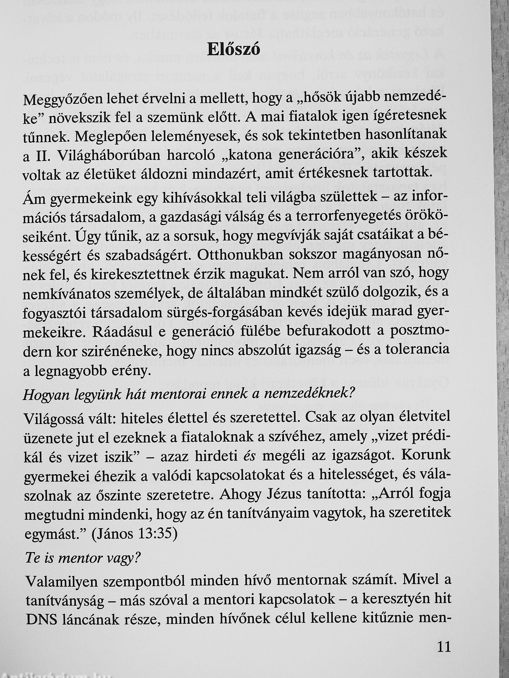 Korunk fiataljai mások, mint az őket megelőző nemzedékek. Ez a generáció nem tudja, milyen volt a világ számítógépek, videójátékok és internet nélkül. A mostani fiatalok bizakodóak, vágynak arra, hogy legyenek szabályok az életükben és támogatják a hagyományos értékeket. Szenvedélyesek, és szeretnék magukat elkötelezni valamilyen nemes ügy mellett. De ezt nem tudják egyedül megvalósítani. Szükségük van iránymutatásra és vezetésre azoktól, akik őszintén törődnek sorsukkal. Hallaniuk kell a Te történeteidet is a sikerekről és kudarcokról egyaránt. Van mit mesélned nekik? Hajlandó vagy vállalni a sebezhetőség kockázatát, és megosztani életed legmeghatározóbb tapasztalatait a következő nemzedékkel?