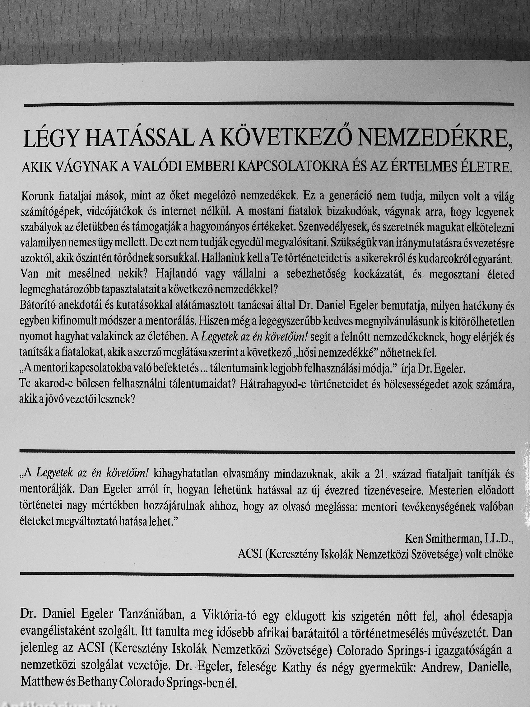 Bátorító anekdotái és kutatásokkal alátámasztott tanácsai által Dr. Dániel Egeler bemutatja, milyen hatékony és egyben kifinomult módszer a mentorálás. Hiszen még a legegyszerűbb kedves megnyilvánulásunk is kitörölhetetlen nyomot hagyhat valakinek az életében. A Legyetek az én követőim! segít a felnőtt nemzedékeknek, hogy elérjék és tanítsák a fiatalokat, akik a szerző meglátása szerint a következő „hősi nemzedékké" nőhetnek fel. „Amentorikapcsolatokba való befektetés tálentumainklegjobbfelhasználásimódja." írja Dr. Egeler. Te akarod-e bölcsen felhasznáhi tálentumaidat? Hátrahagyod-e történeteidet és bölcsességedet azok számára, akik a jövő vezetői lesznek?