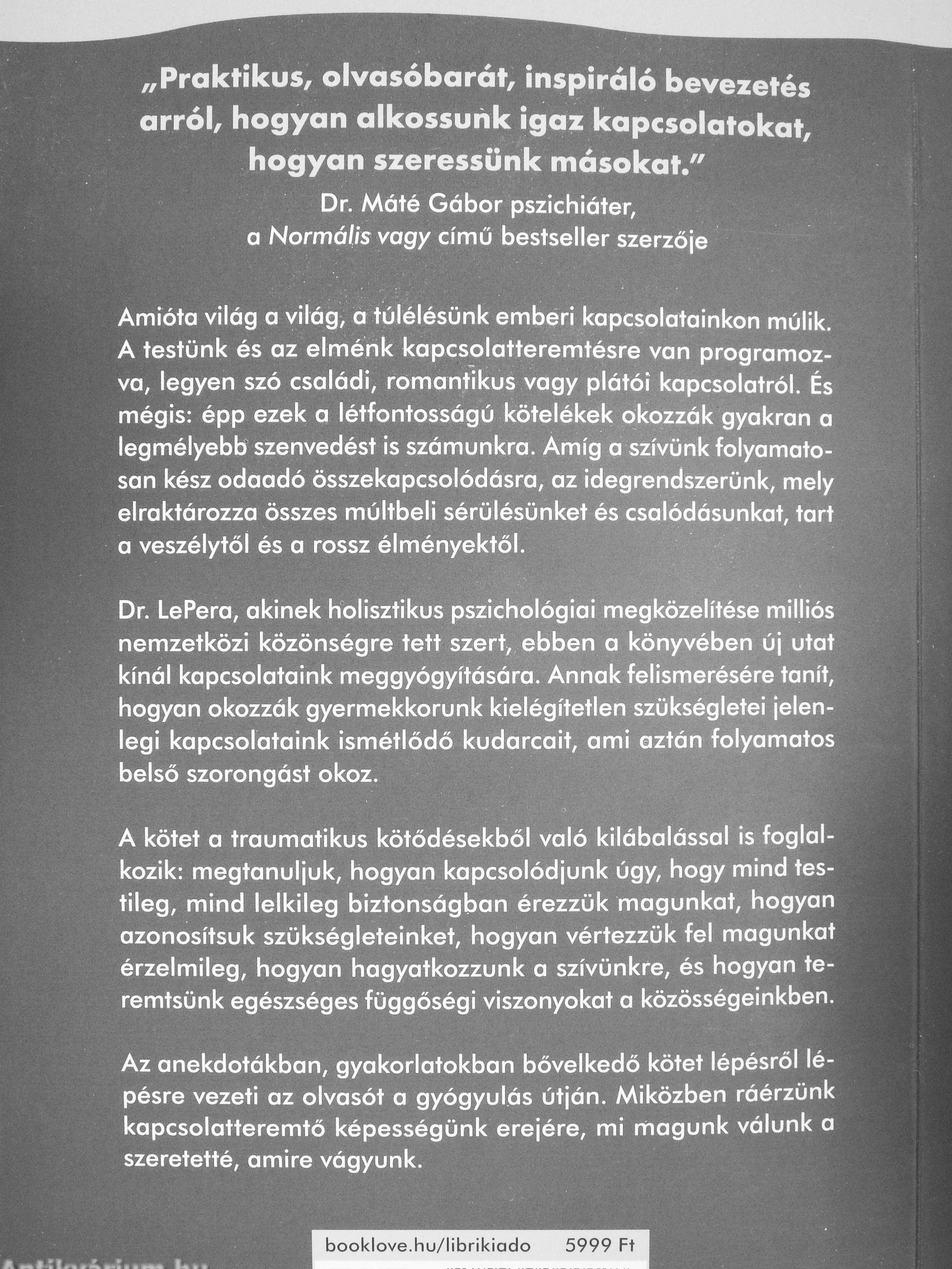 Dr. LePera, akinek holisztikus pszichológiai megközelítése milliós nemzetközi közönségre tett szert, ebben a könyvében új utat kínál kapcsolataink meggyógyítására. Annak felismerésére tanít, hogyan okozzák gyermekkorunk kielégítetlen szükségletei jelenlegi kapcsolataink ismétlődő kudarcait, ami aztán folyamatos belső szorongást okoz.