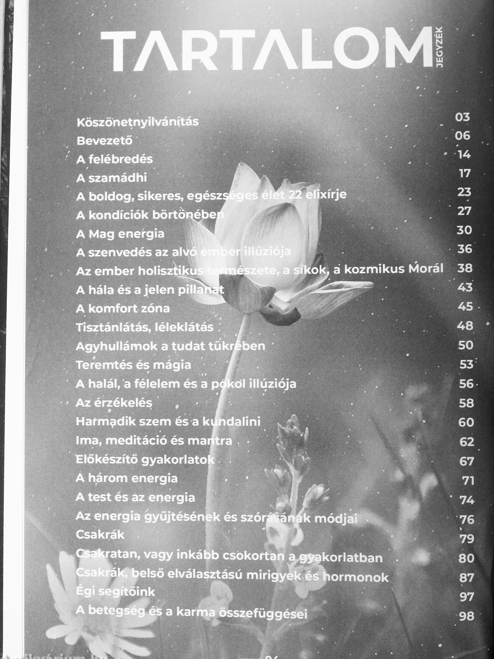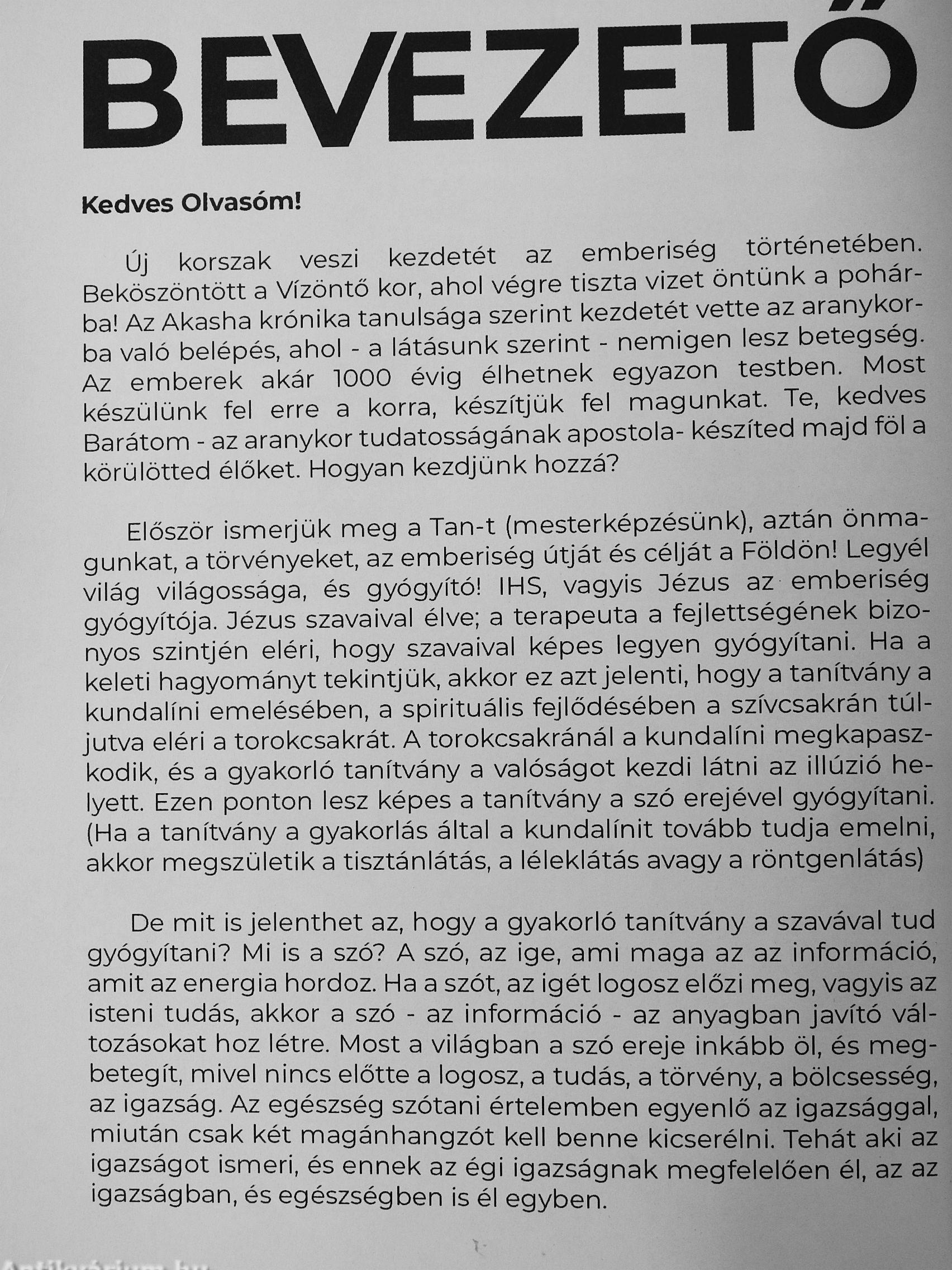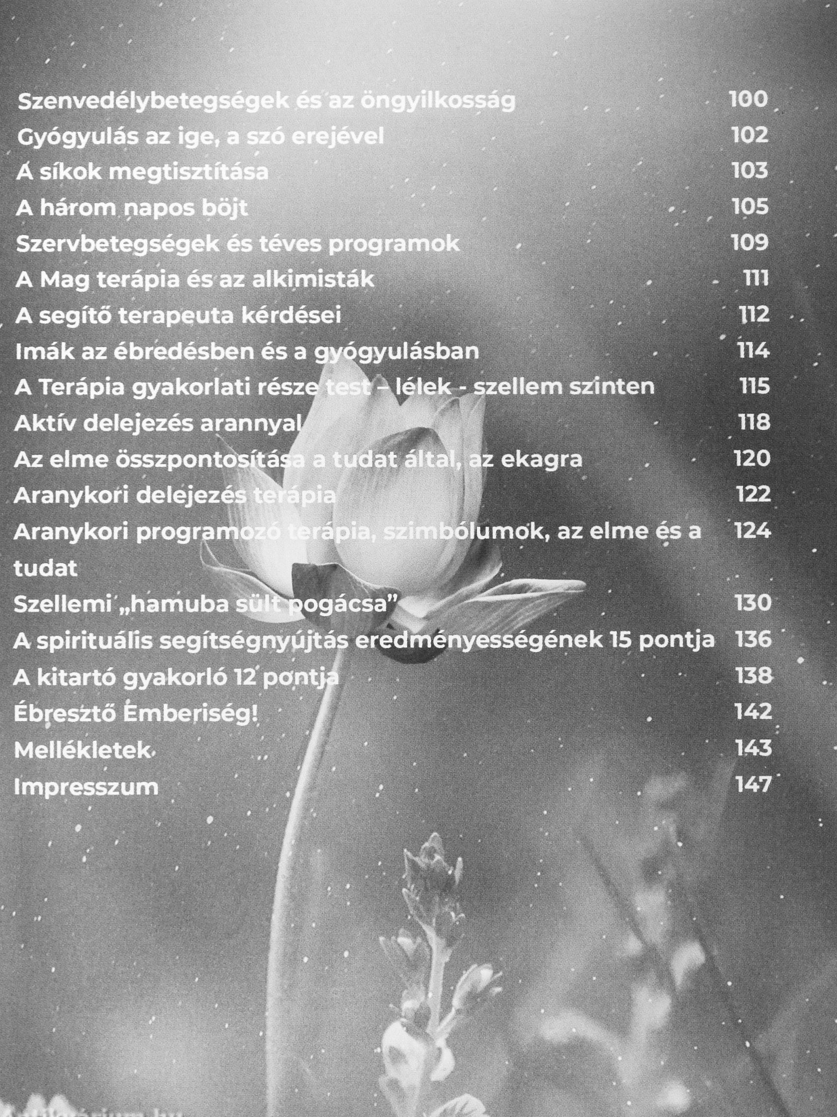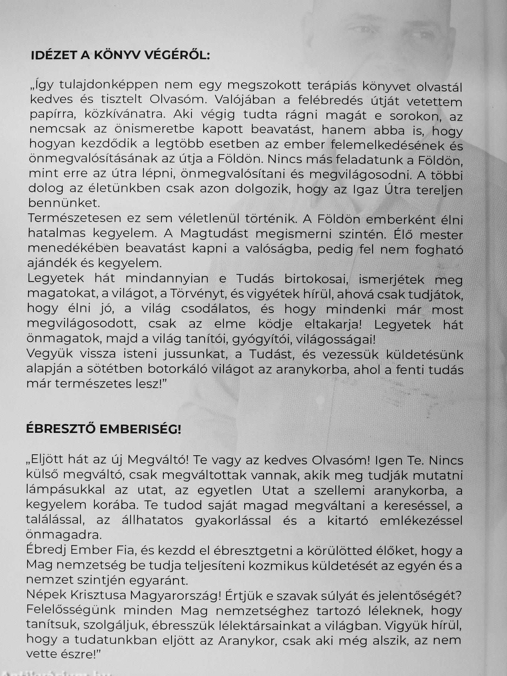 „így tulajdonképpen nem egy megszokott terápiás könyvet olvastál kedves és tisztelt Olvasóm. Valójában a felébredés útját vetettem papírra, közkívánatra. Aki végig tudta rágni magát e sorokon, az nemcsak az önismeretbe kapott beavatást, hanem abba is, hogy hogyan kezdődik a legtöbb esetben az ember felemelkedésének és önmegvalósításának az útja a Földön. Nincs más feladatunk a Földön, mint erre az útra lépni, önmegvalósítani és megvilágosodni. A többi dolog az életünkben csak azon dolgozik, hogy az Igaz Útra tereljen bennünket.