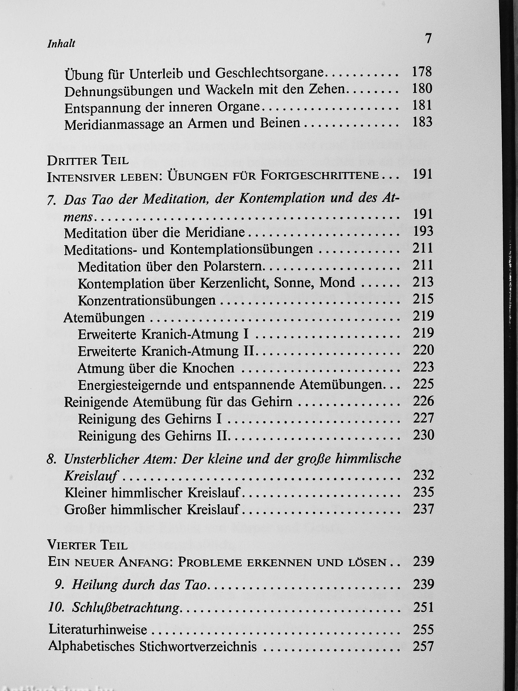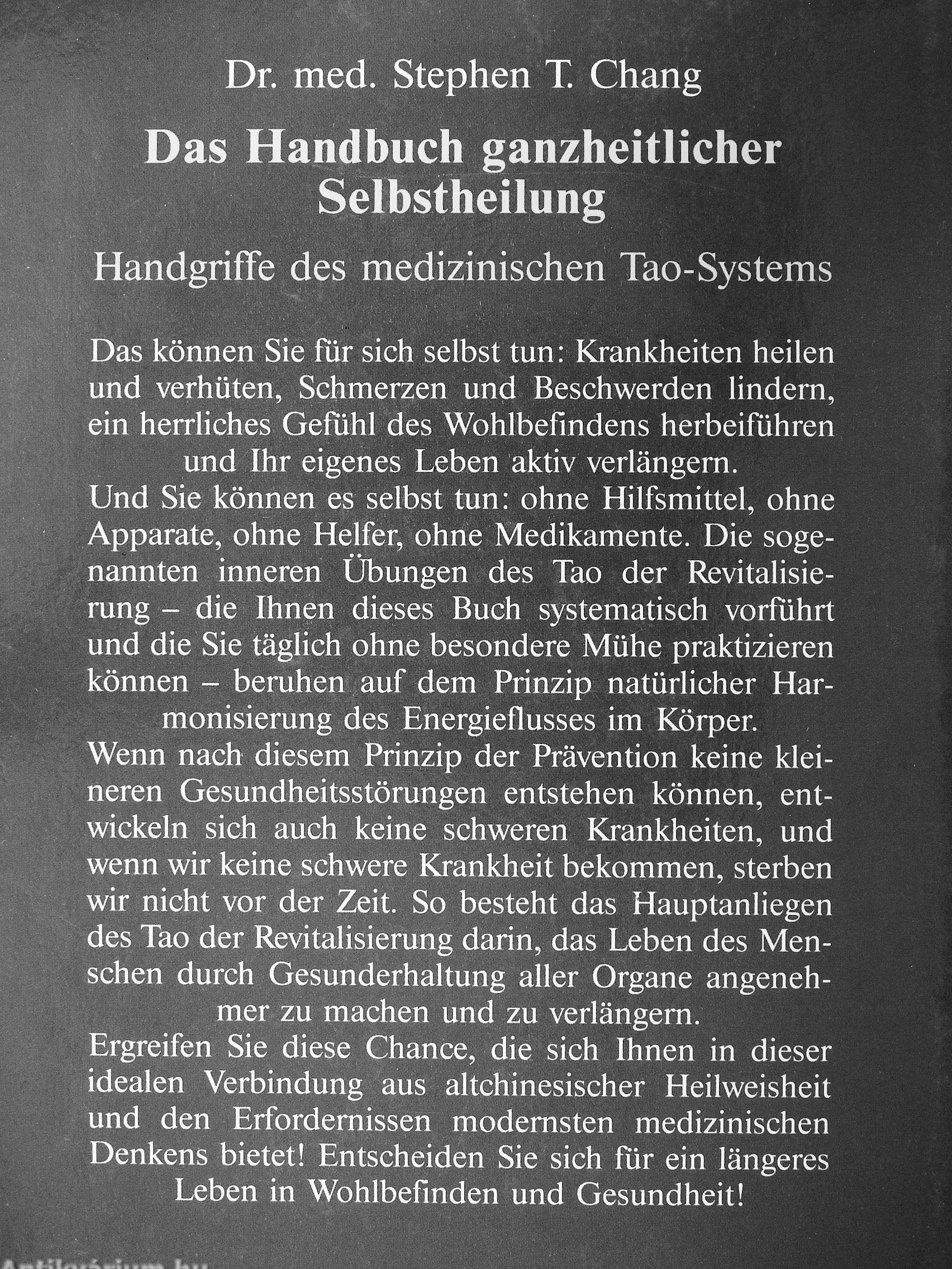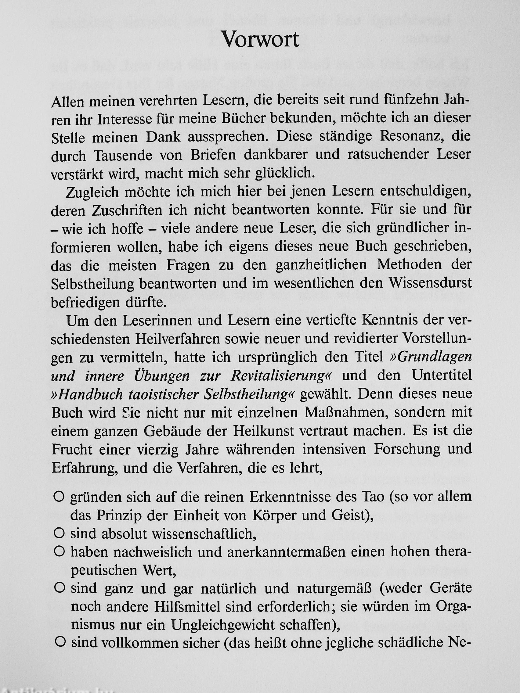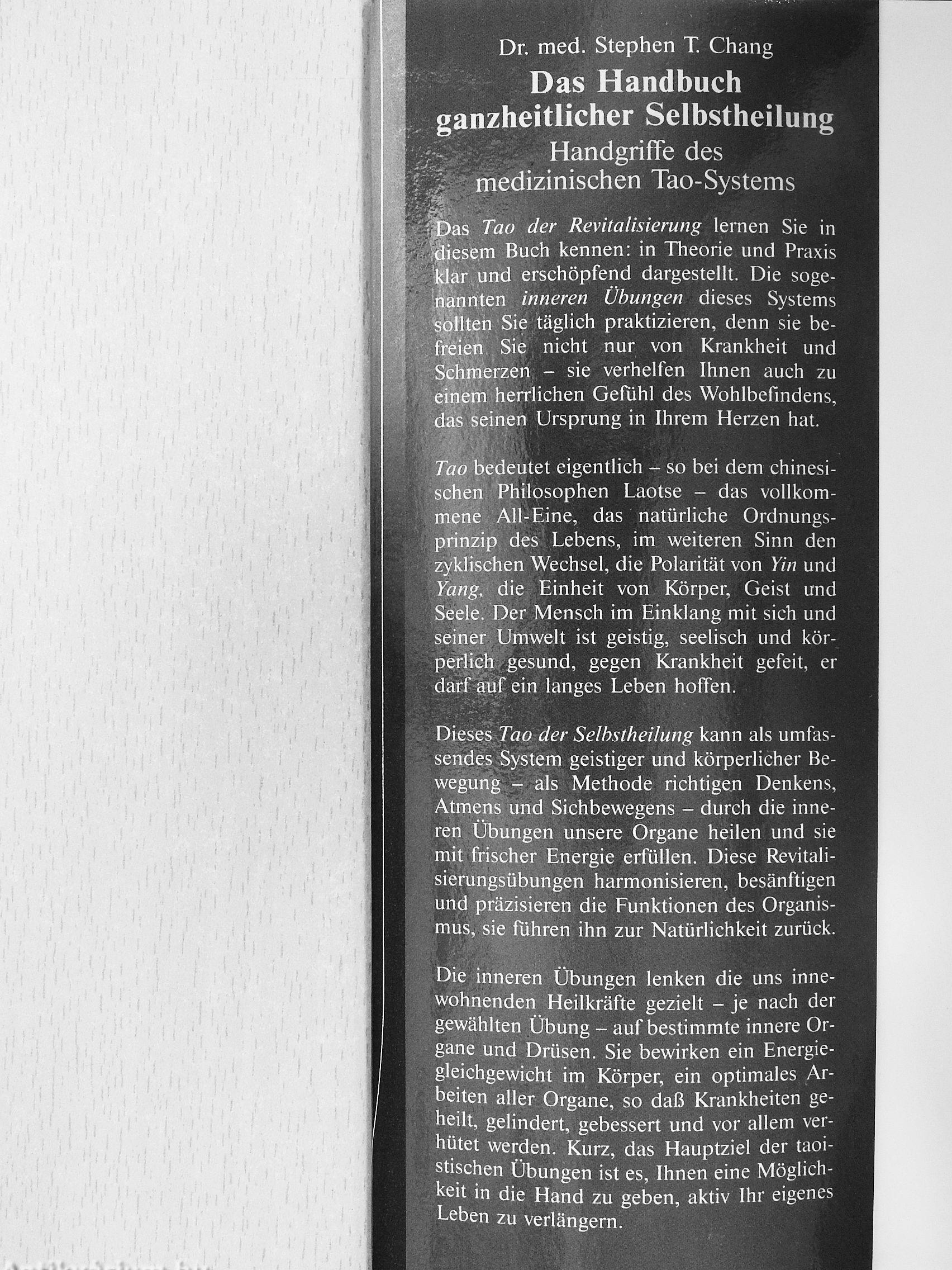 Dieses Tao der Selbstheilung kann als umfassendes System geistiger und körperlicher Bewegung - als Methode richtigen Denkens, Atmens und Sichbewegens - durch die inneren Übungen unsere Organe heilen und sie mit frischer Energie erfüllen. Diese Revitali-sierungsübungen harmonisieren, besänftigen und präzisieren die Funktionen des Organismus, sie führen ihn zur Natürlichkeit zurück.