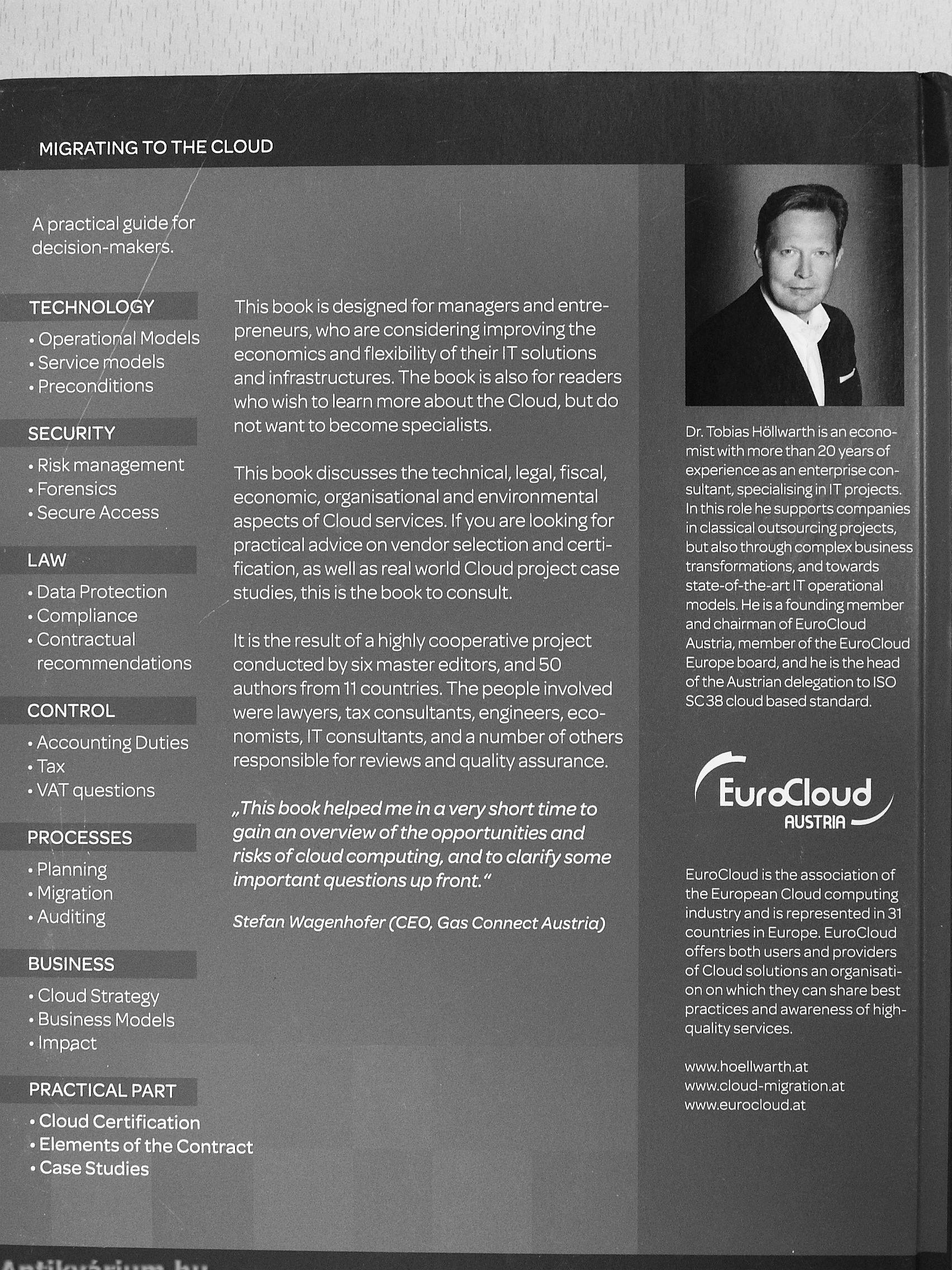 Dr. Tobias Hollwarth is an economist with more than 20 years of experience as an enterprise consultant, specialising in IT projects. In this role he supports companies in classical outsourcing projects, but also through complex business transformations, and towards state-of-the-art IT operational models. He is a founding member and chairman of EuroCloud Austria, member of the EuroCloud Europe board, and he is the head ofthe Austrian delegation to ISO SC38 cloud based standard.