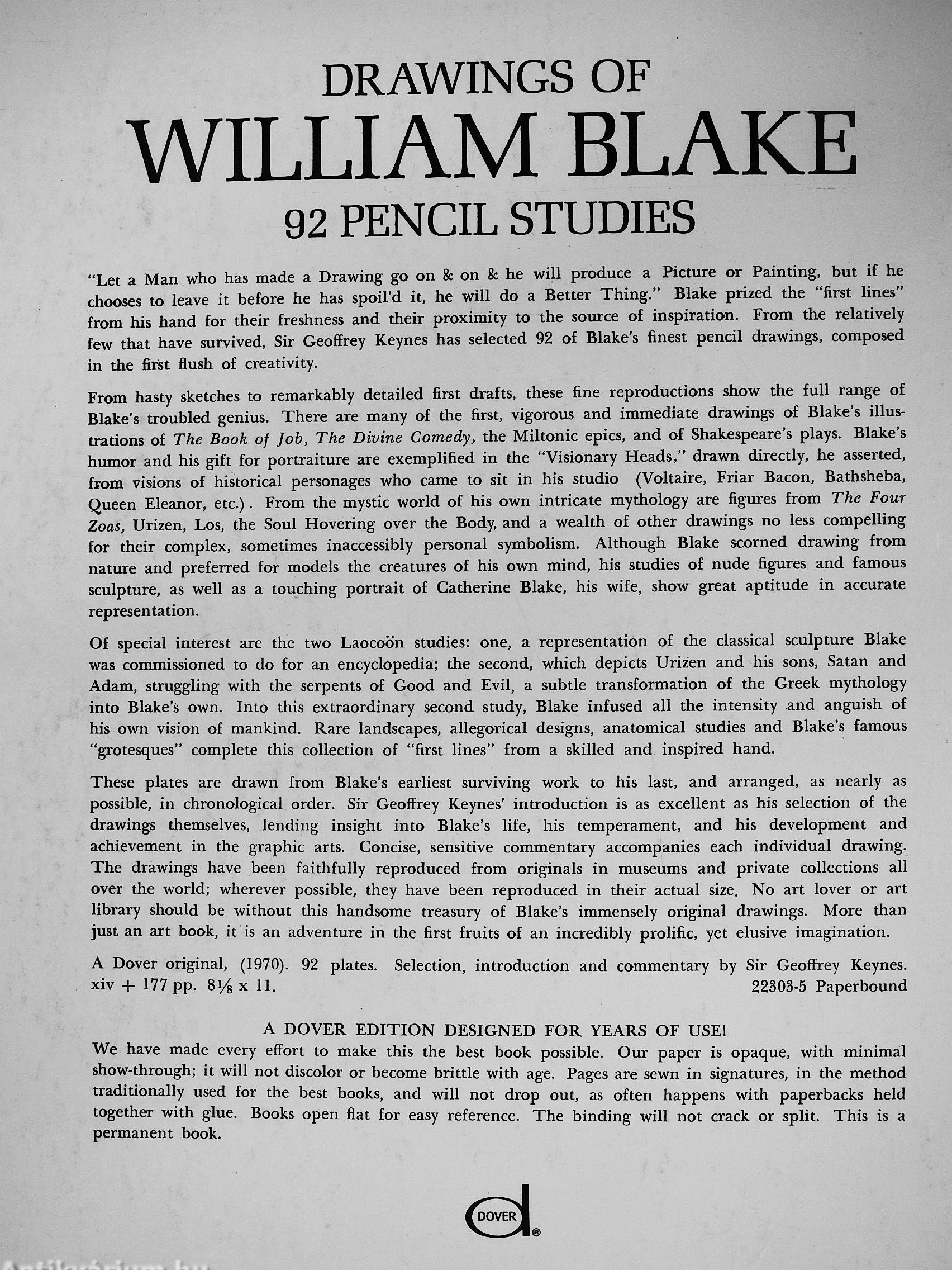 "Let a Man who has made a Drawing go on on he will produce a Picture or Painting, but if he chooses to leave it before he has spoil'd it, he will do a Better Thing." Blake prized the "first lines" from his hand for their freshness and their proximity to the source of inspiration. From the relatively few that have survived, Sir Geoffrey Keynes has selected 92 of Blake's finest pencil drawings, composed in the first flush of creativity.