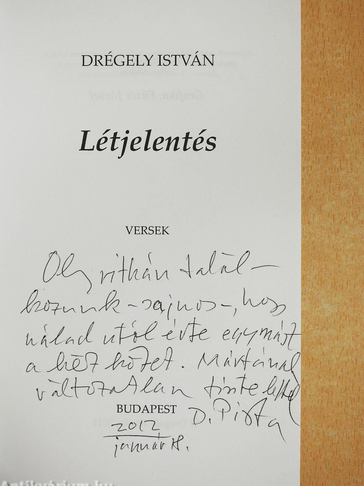 A címlapon a szerző, Drégely István névre szóló dedikációja látható.