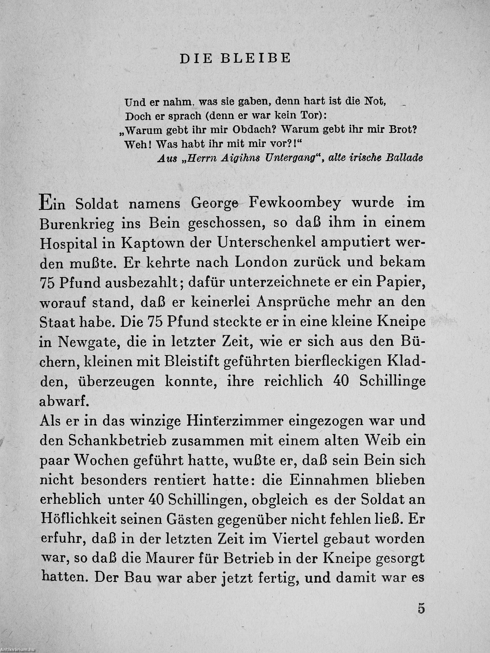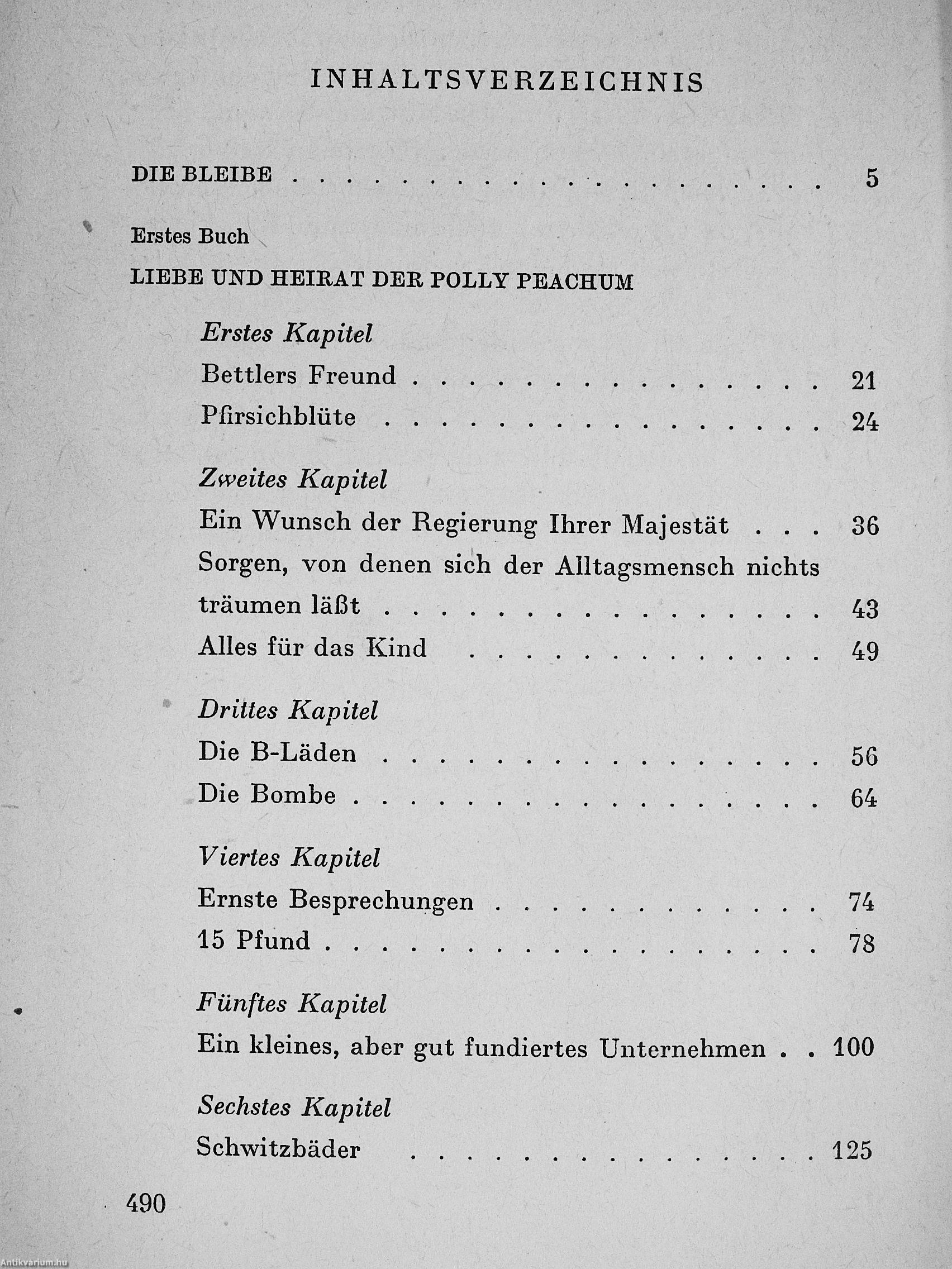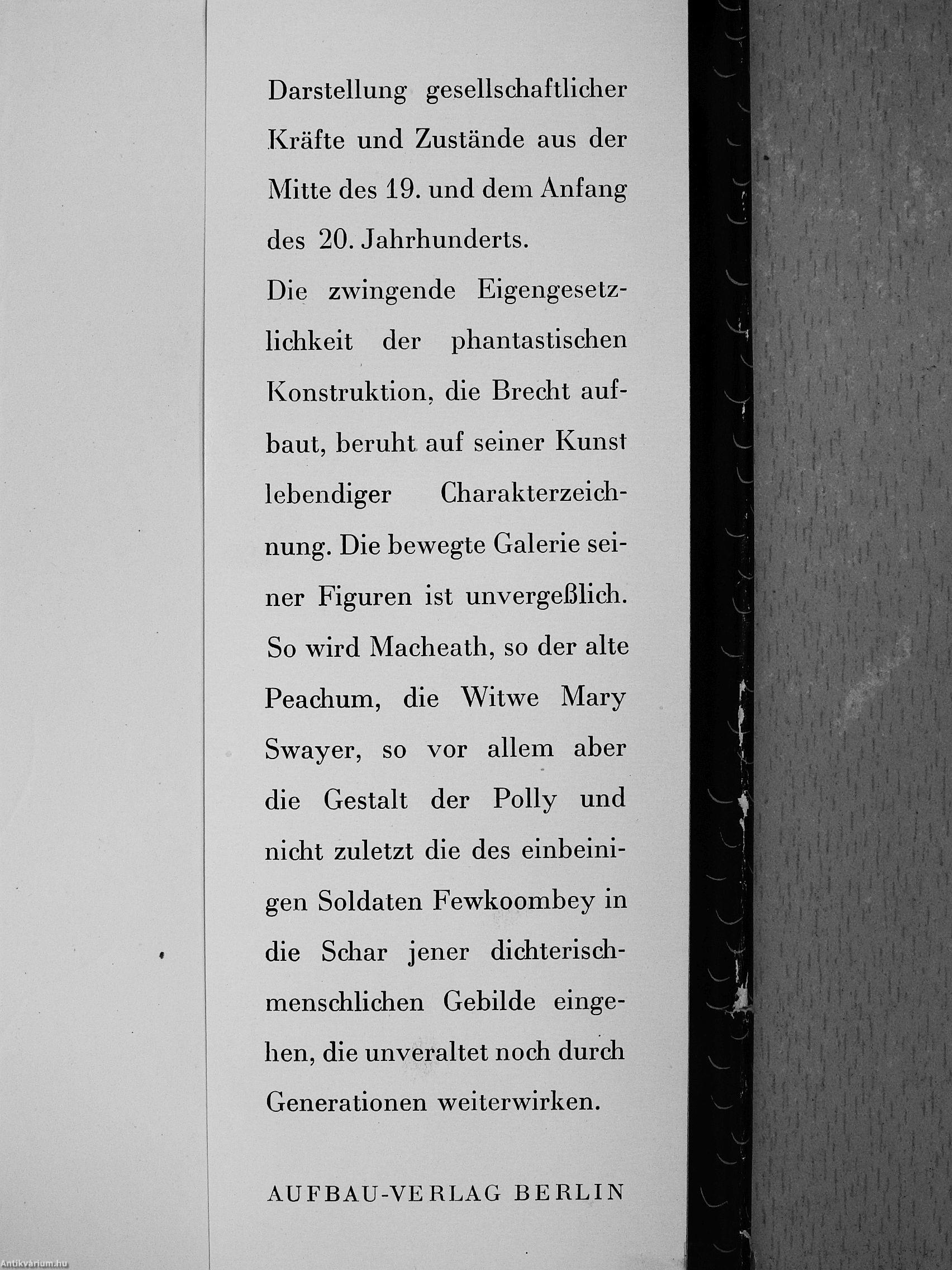 Darstellung gesellschaftlicher Kräfte und Zustände aus der Mitte des 19. und dem Anfang des 20. Jahrhunderts. Die zwingende Eigengesetzlichkeit der phantastischen Konstruktion, die Brecht aufbaut, beruht auf seiner Kunst lebendiger Charakterzeichnung. Die bewegte Galerie seiner Figuren ist unvergeßlich. So wird Macheath, so der alte Peachum, die Witwe Mary Swayer, so vor allem aber die Gestalt der Polly und nicht zuletzt die des einbeinigen Soldaten Fewkoombey in die Schar jener dichterisdi-menschlichen Gebilde eingehen, die unveraltet noch durch Generationen weiterwirken.