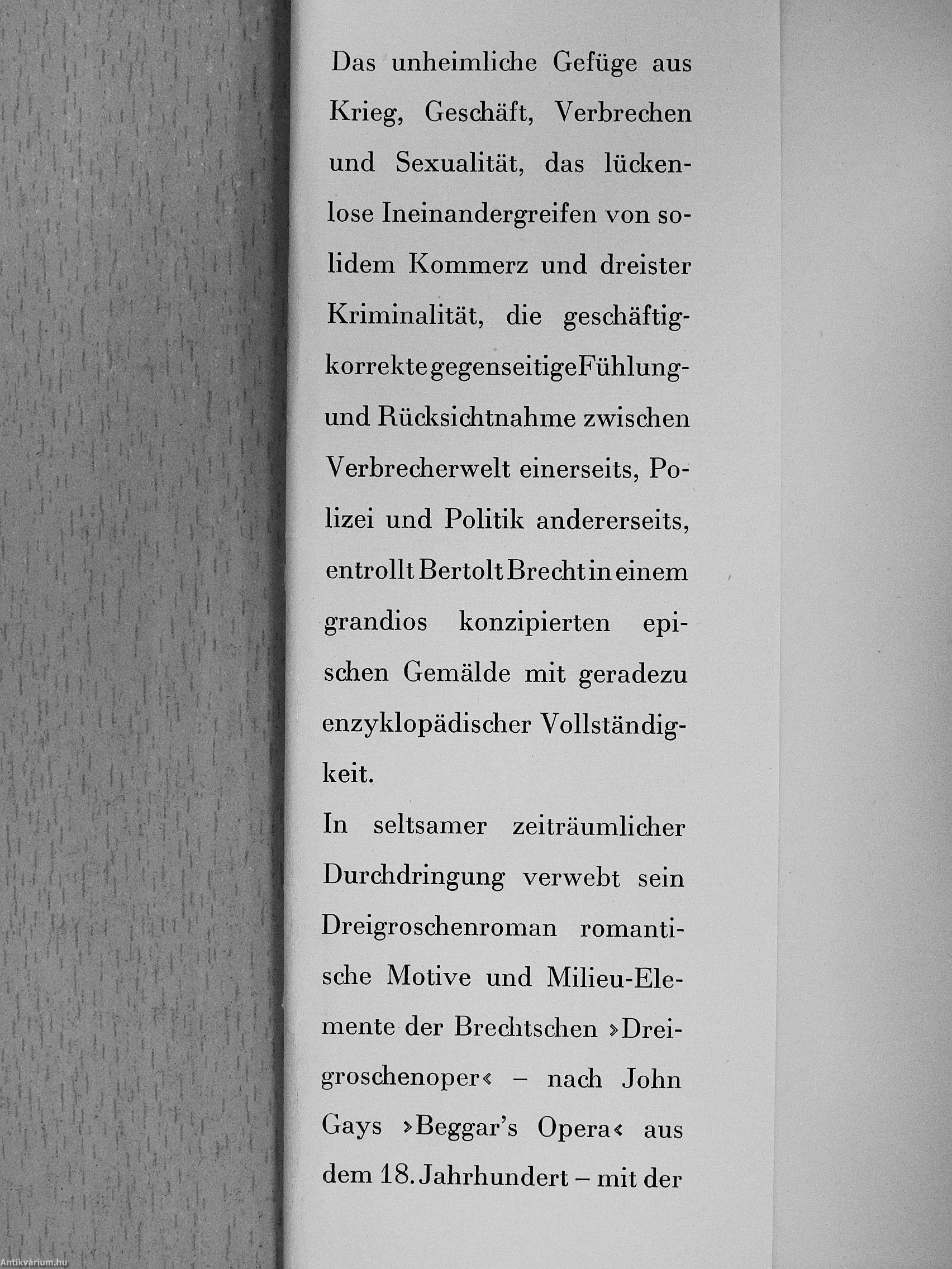 Das unheimlidie Gefüge aus Krieg, Geschäft, Verbrechen und Sexualität, das lückenlose Ineinandergreifen von solidem Kommerz und dreister Kriminalität, die geschäftig-korrekte gegenseitigeFühlung-und Rücksichtnahme zw^ischen Verbrecherwelt einerseits, Polizei und Politik andererseits, entrollt BertoltBrechtin einem grandios konzipierten epischen Gemälde mit geradezu enzyklopädischer Vollständigkeit.