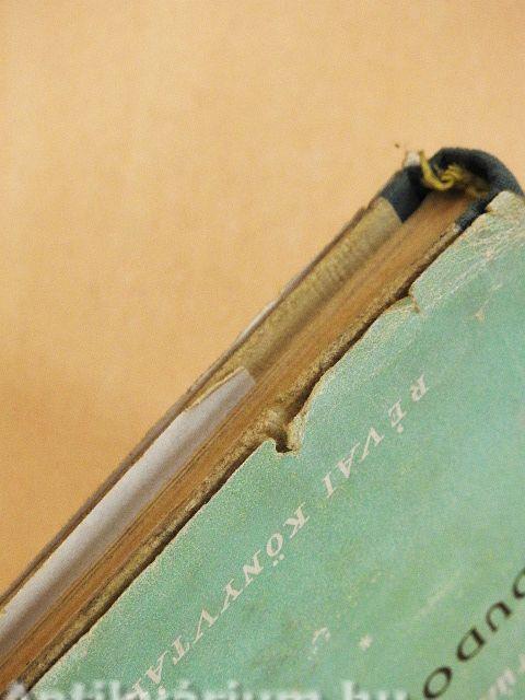 A védőborító kopott, foltos és hiányos. Néhány oldalon bejegyzés látható. A kötés megtört. Néhány oldal foltos.