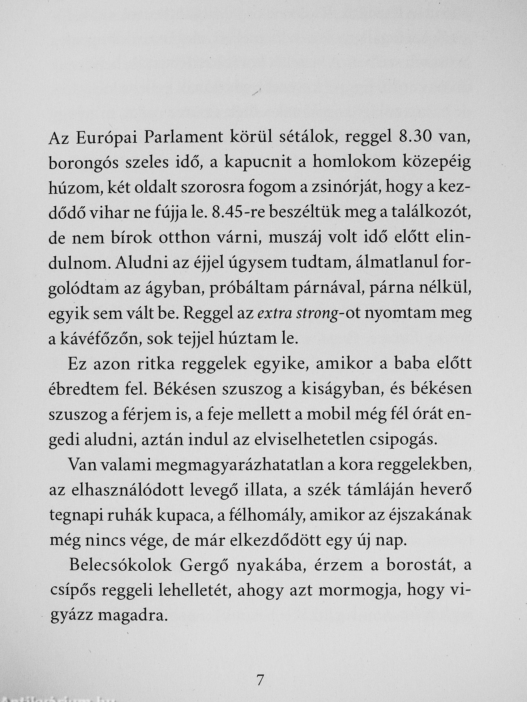 „Nekiálltam a mosásnak. Kiborítottam a nappali közepére a szennyeskosarat, és válogattam. 40 fokon fehérek, sötétek, külön a babaholmi. Gergő alsógatyája volt a kezemben, amikor kitört belőlem a zokogás. Hogy a rohadt életbe, nem erről volt szó! Én nem akarok házicseléd lenni!"
