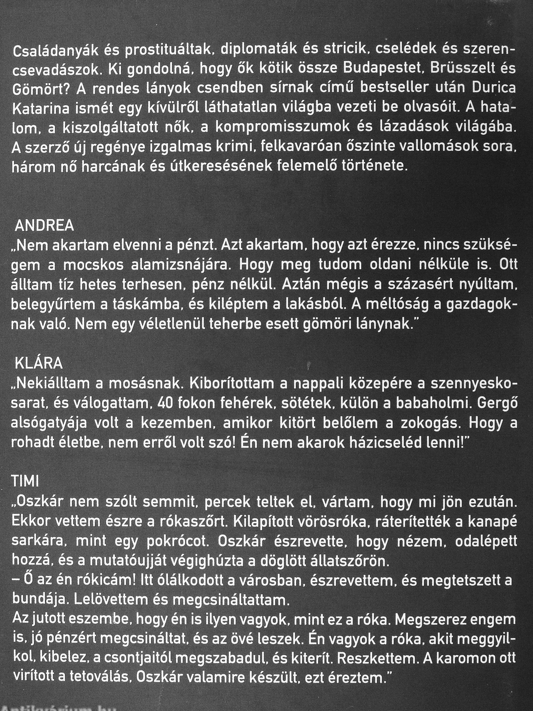 Családanyák és prostituáltak, diplomaták és stricik, cselédek és szerencsevadászok. Ki gondolná, hogy ők kötik össze Budapestet, Brüsszelt és Gömört? A rendes lányok csendben sírnak című bestseller után Durica Katarina ismét egy kívülről láthatatlan világba vezeti be olvasóit. A hatalom, a kiszolgáltatott nők, a kompromisszumok és lázadások világába. A szerző új regénye izgalmas krimi, felkavaróan őszinte vallomások sora, három nő harcának és útkeresésének felemelő története.