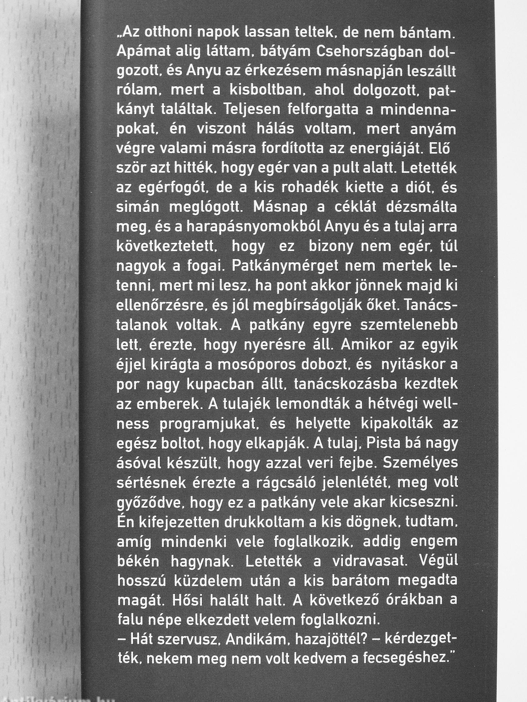 „Az otthoni napok lassan teltek, de nem bántam. Apámat alig láttam, bátyám Csehországban dolgozott. és Anyu az érkezésem másnapján leszállt rólam, mert a kisboltban, ahol dolgozott, patkányt találtak. Teljesen felforgatta a mindennapokat, én viszont hálás voltam, mert anyám végre valami másra fordította az energiáját. Elő ször azt hitték, hogy egér van a pult alatt. Letették az egérfogót, de a kis rohadék kiette a diót, és simán meglógott. Másnap a céklát dézsmálta meg. és a harapásnyomokból Anyu és a tulaj arra következtetett, hogy ez bizony nem egér, túl nagyok a fogai. Patkánymérget nem mertek letenni. mert mi lesz. ha pont akkor jönnek majd ki ellenőrzésre, és jól megbírságolják őket. Tanácstalanok voltak. A patkány egyre szemtelenebb lett. érezte, hogy nyerésre áll. Amikor az egyik éjjel kirágta a mosóporos dobozt, és nyitáskor a por nagy kupacban állt. tanácskozásba kezdtek az emberek. A tulajék lemondták a hétvégi well-ness programjukat, és helyette kipakolták az egész boltot, hogy elkapják. A tulaj, Pista bá nagy ásóval készült, hogy azzal veri fejbe. Személyes sértésnek érezte a rágcsáló jelenlétét, meg volt győződve, hogy ez a patkány vele akar kicseszni. Én kifejezetten drukkoltam a kis dögnek, tudtam, amíg mindenki vele foglalkozik, addig engem békén hagynak. Letették a vidravasat. Végül hosszú küzdelem után a kis barátom megadta magát. Hősi halált halt. A következő órákban a falu népe elkezdett velem foglalkozni. - Hát szervusz, Andikám, hazajöttél? - kérdezgették, nekem meg nem volt kedvem a fecsegéshez."