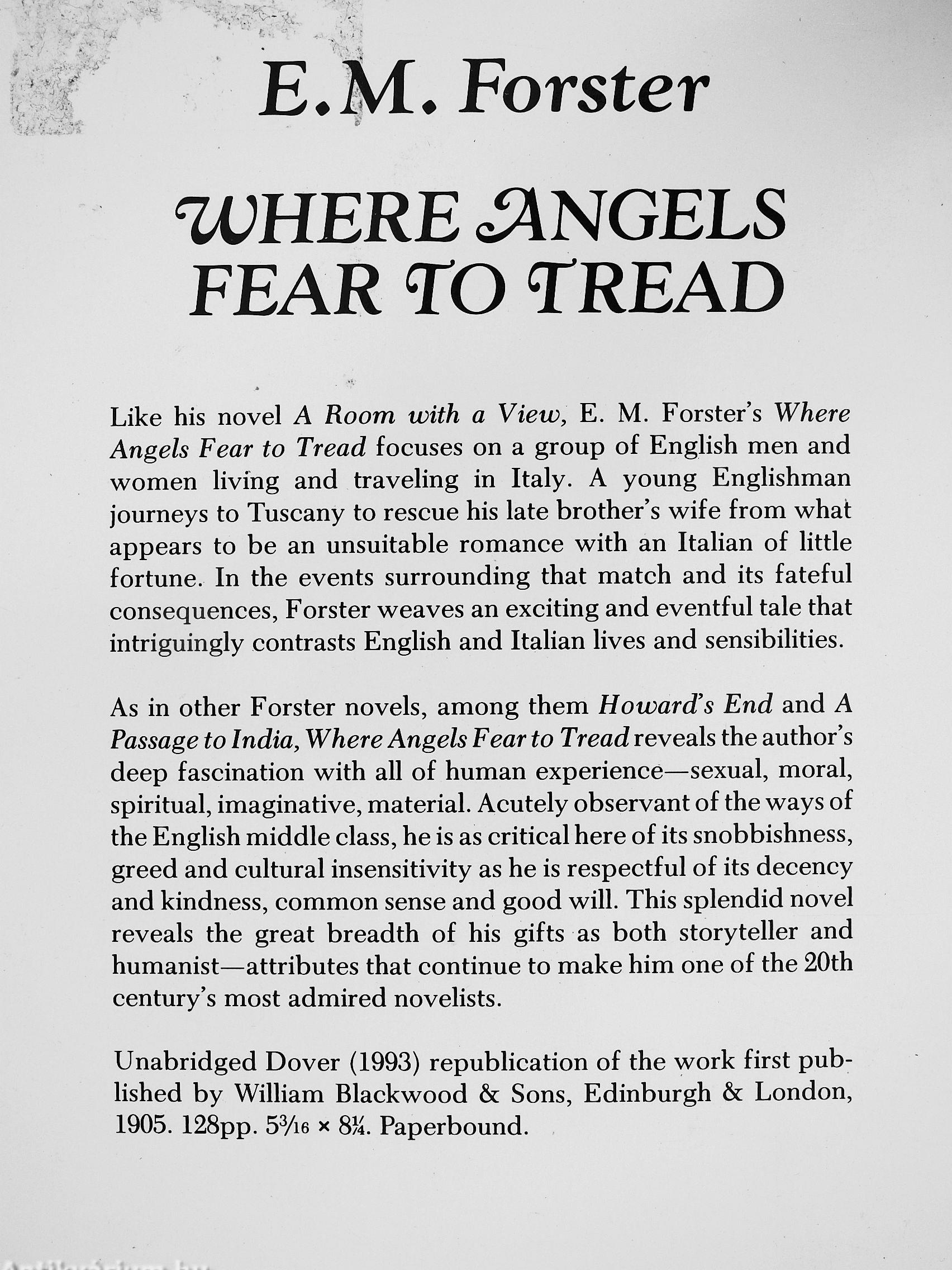 Like his novel A Room with a View, E. M. Forster's Where Angels Fear to Tread focuses on a group of English men and women living and traveling in Italy. A young Englishman journeys to Tuscany to rescue his late brother's wife from what appears to be an unsuitable romance with an Italian of little fortune. In the events surrounding that match and its fateful consequences. Forster weaves an exciting and eventful tale that intriguingly contrasts English and Italian lives and sensibilities.