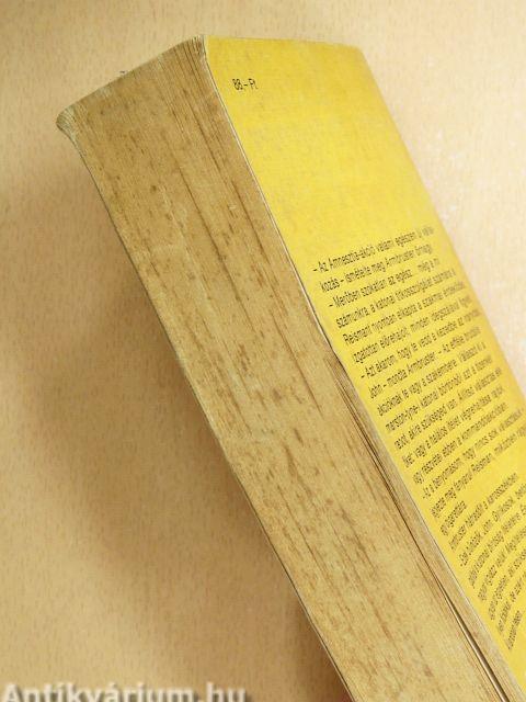 A gerinc elszíneződött, kopott, megtört. A borító belső oldalai, a lapélek és néhány lap foltos.