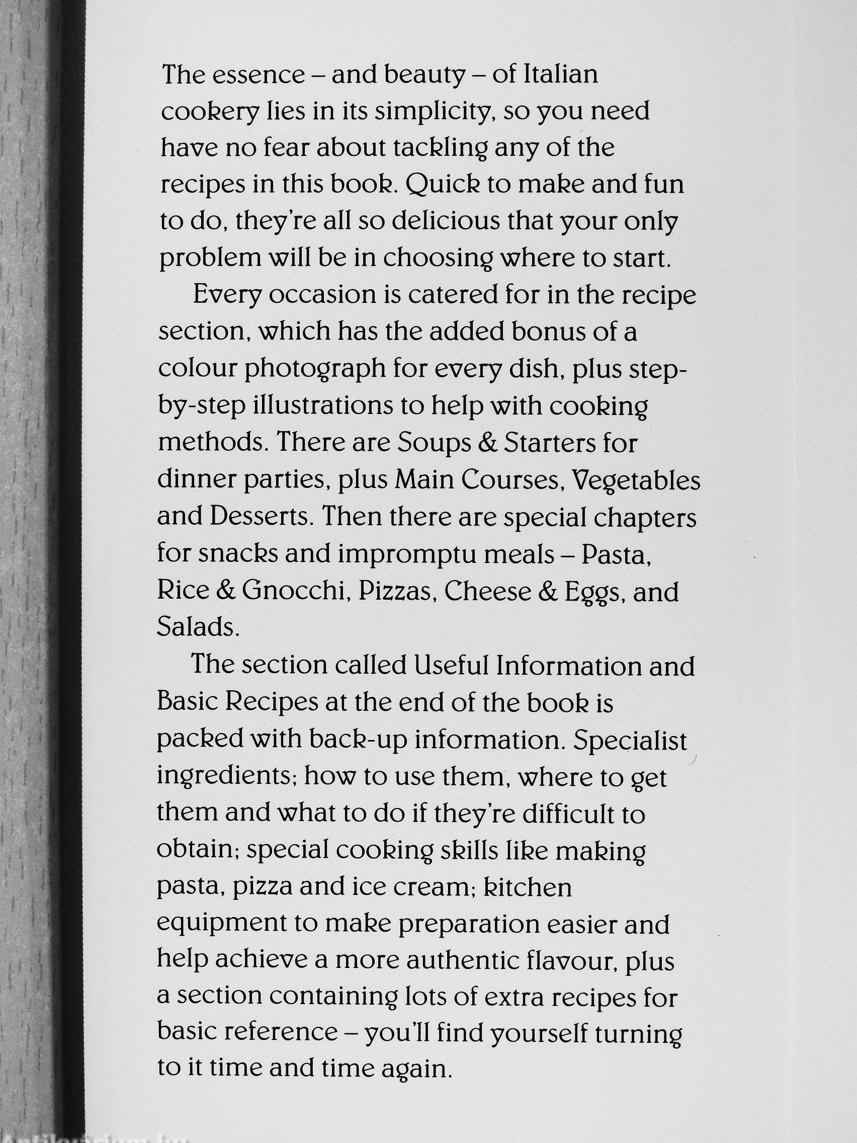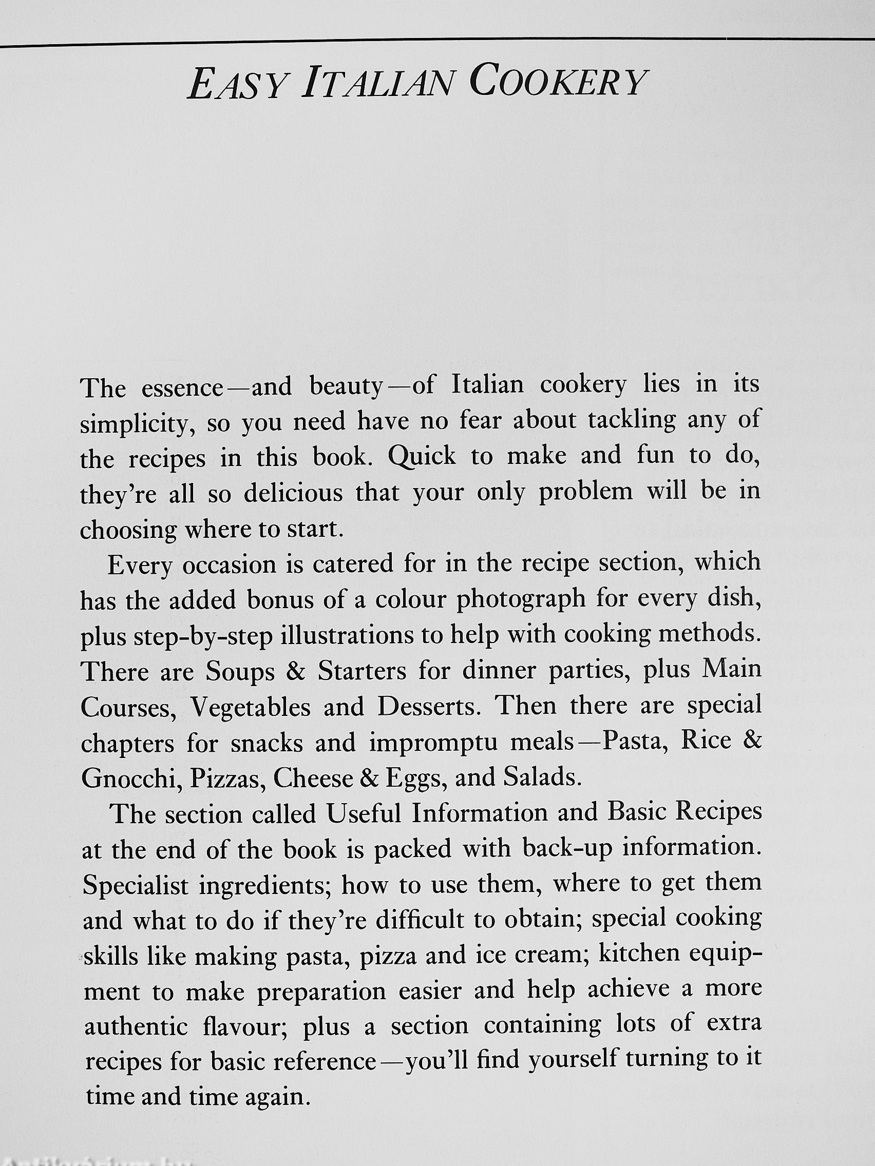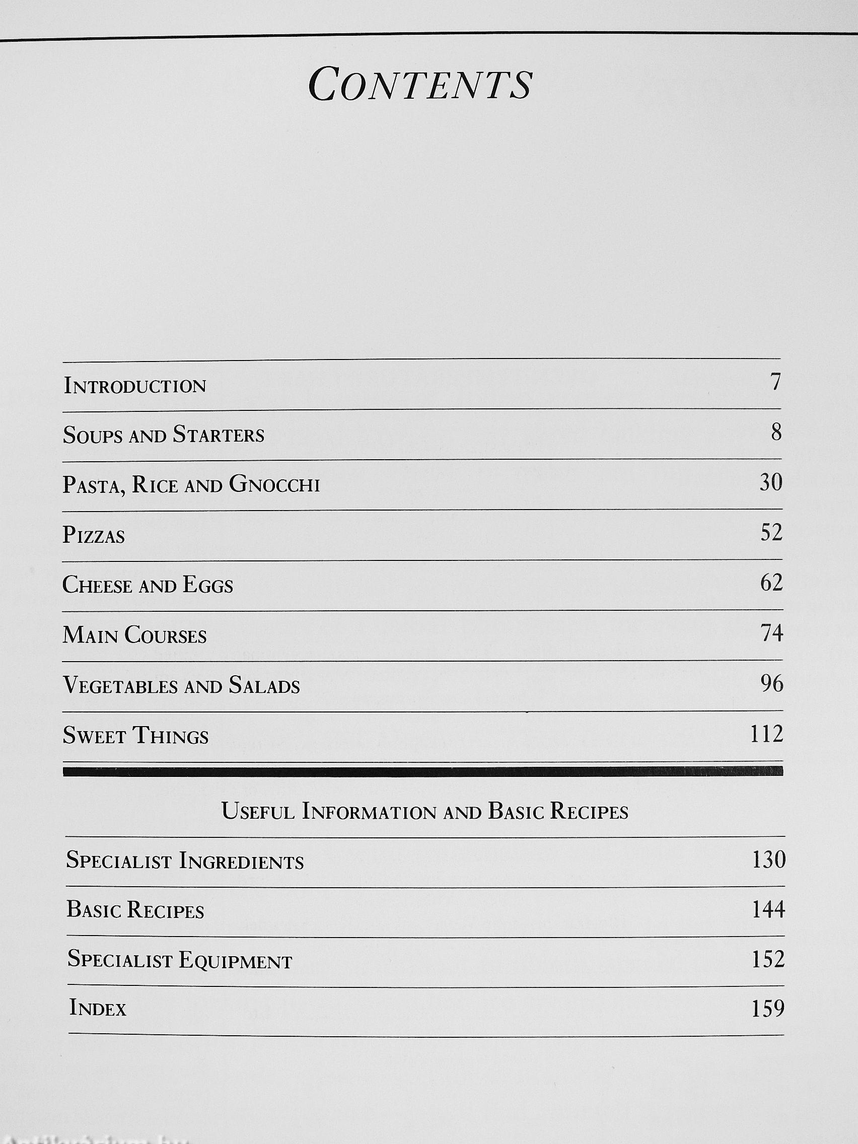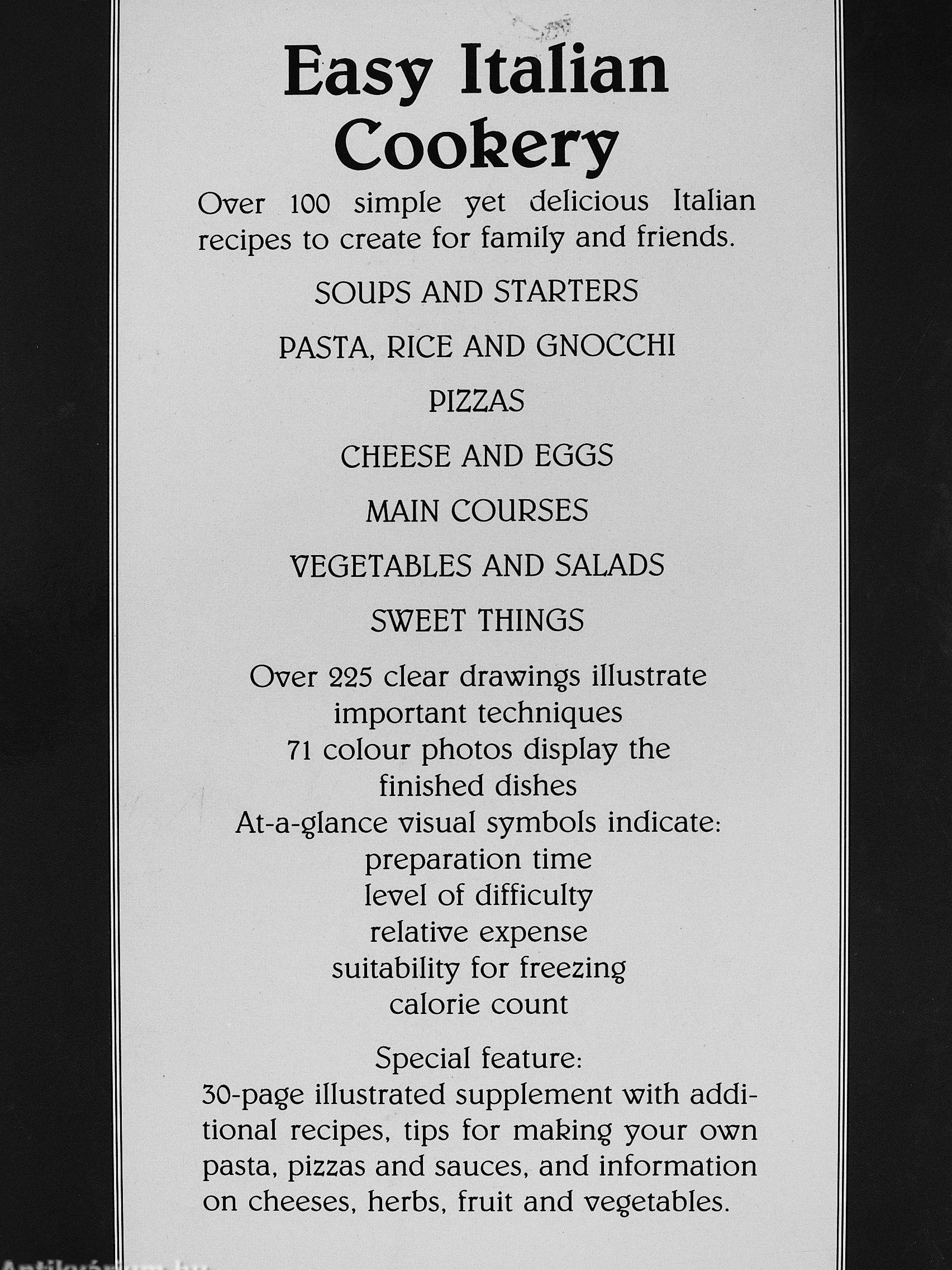 Special feature: 30-page illustrated supplement with additional recipes, tips for mafeing your own pasta, pizzas and sauces, and information on cheeses, herbs, fruit and vegetables.