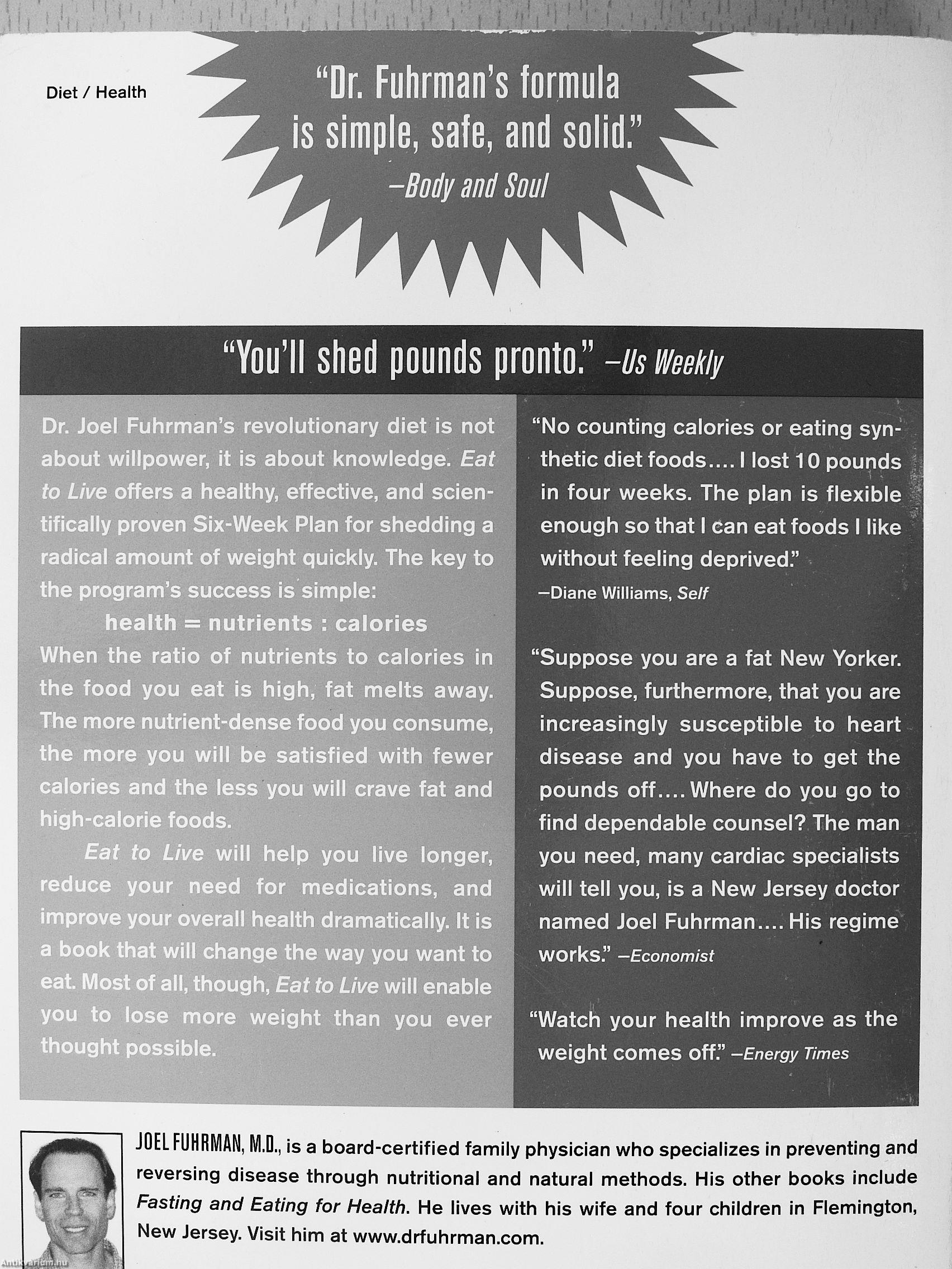 "Suppose you are a fat New Yorker. Suppose, furthermore, that you are increasingly susceptible to heart disease and you have to get the pounds off Where do you go to find dependable counsel? The man you need, many cardiac specialists will tell you, is a New Jersey doctor named Joel Fuhrman His regime works." —Economist