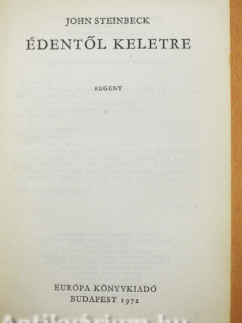 Ennek a hatalmas családregénynek színtere főként Kalifornia, s a kaliforniai Salinas városa. De a sokfelé ágazó és sokfelől egybefutó cselekményekből szinte határtalan körkép rajzolódik elő: a századeleji Amerika bonyolult társadalmi ellentmondásokkal zsúfolt, látványos freskója. Két család története bontakozik ki a regény lapjain, s a Trask fiúk sorsa szorosan egybefonódik az író, John Steinbeck családjának sorsával. A váltakozó nemzedékek sora, de elsősorban az író, John Steinbeck családjának sorsával. A váltakozó nemzedékek sora, de elsősorban az író nagyapja, az Írországból bevándorolt Samuel Hamilton életútja híven tükrözi az amerikai demokrácia illúziójának leépülési folyamatát. Át- meg átszövik a regényt a szerelem szálai: a bajt hozó, sötét erő testesül meg a gyalázatosan romlott Kate alakjában, s a történet végén egy erős, igaz érzés ragyog fel, két fiatal élet megváltó, boldog ígérete.