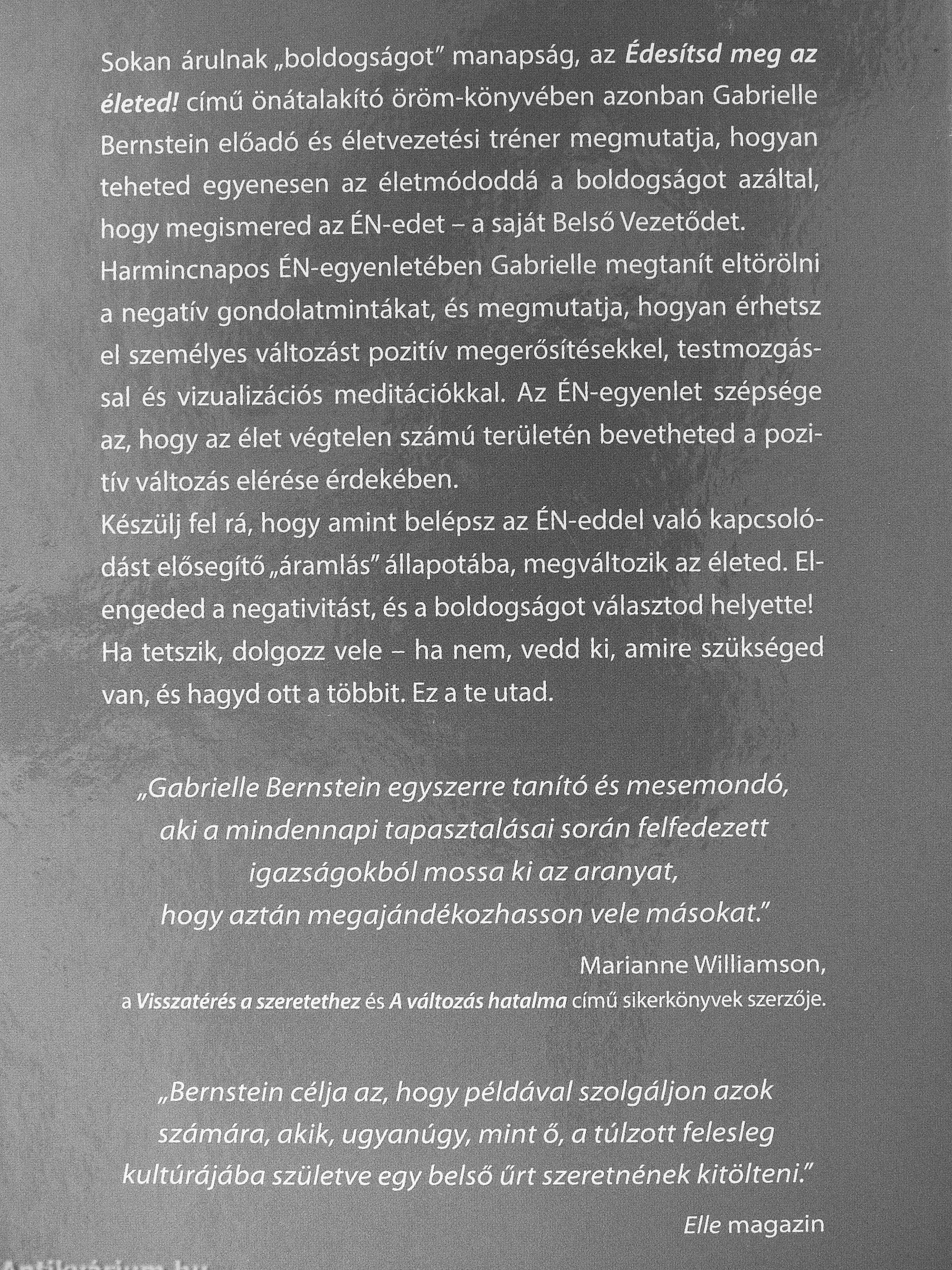 Sokan árulnak „boldogságot" manapság, az Édesítsd meg az életed! című önátalakító öröm-könyvében azonban Gabrielle Bernstein előadó és életvezetési tréner megmutatja, hogyan teheted egyenesen az életmódoddá a boldogságot azáltal, hogy megismered az ÉN-edet - a saját Belső Vezetődet. Harmincnapos ÉN-egyenletében Gabrielle megtanít eltörölni a negatív gondolatmintákat, és megmutatja, hogyan érhetsz el személyes változást pozitív megerősítésekkel, testmozgással és vizualizációs meditációkkal. Az ÉN-egyenlet szépsége az, hogy az élet végtelen számú területén bevetheted a pozitív változás elérése érdekében.