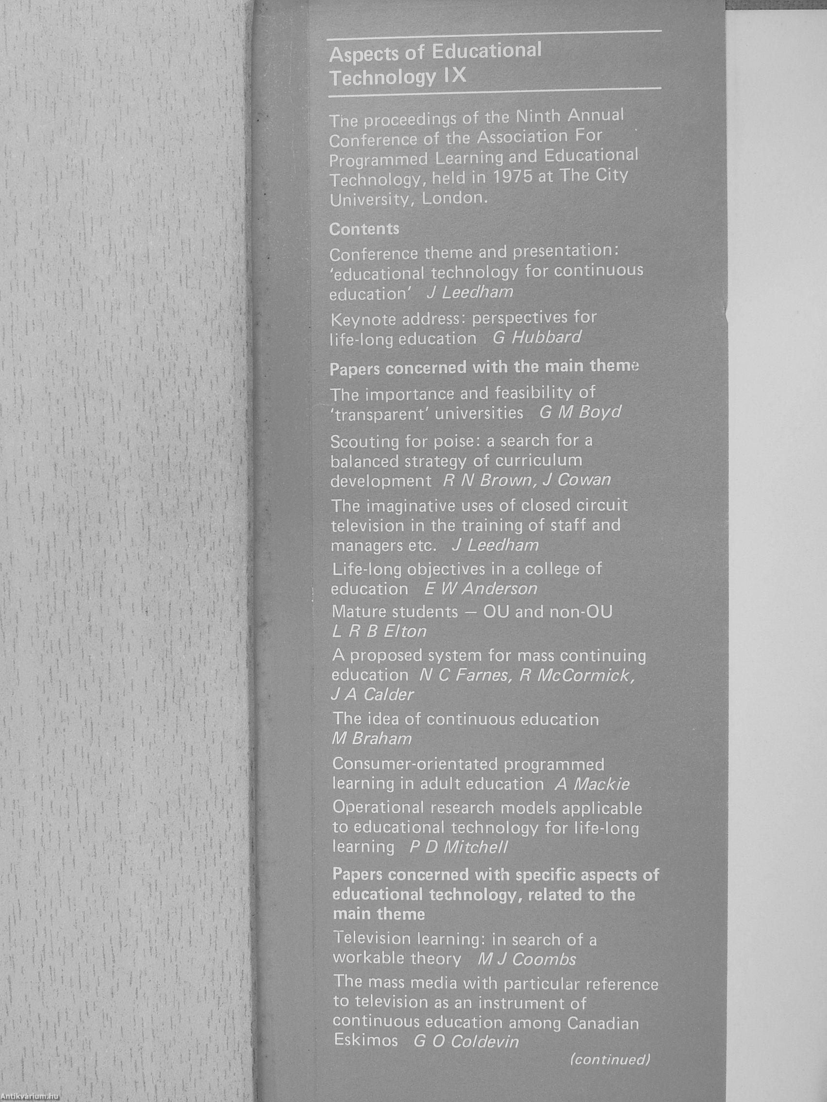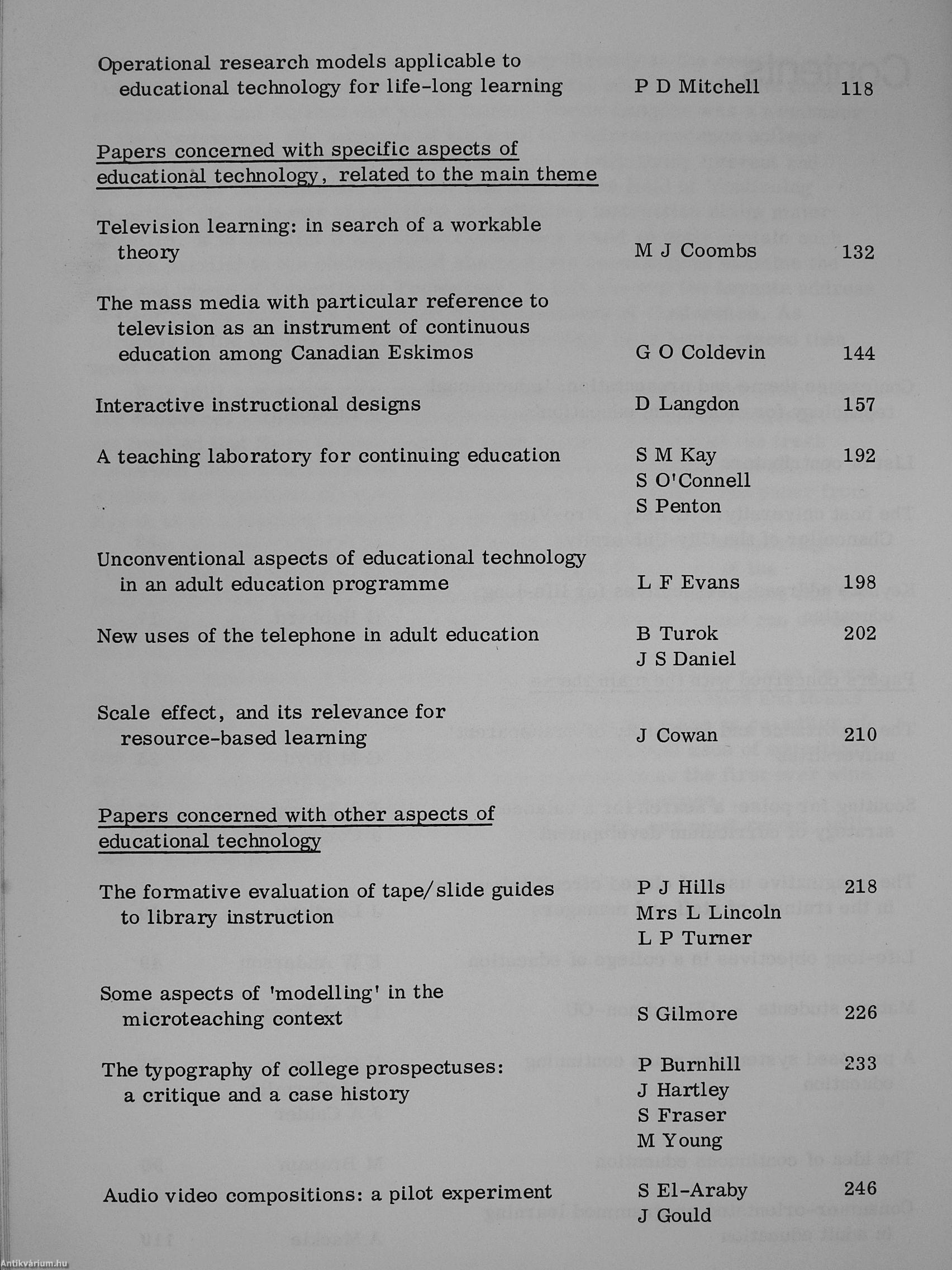 Scouting for poise: a search for a balanced strategy of curriculum development R N Brown, J Cowan The imaginative uses of closed circuit television in the training of staff and managers etc. J Leedham Life-long objectives in a college of education E W Anderson Mature students - OU and non-OU L R B Elton