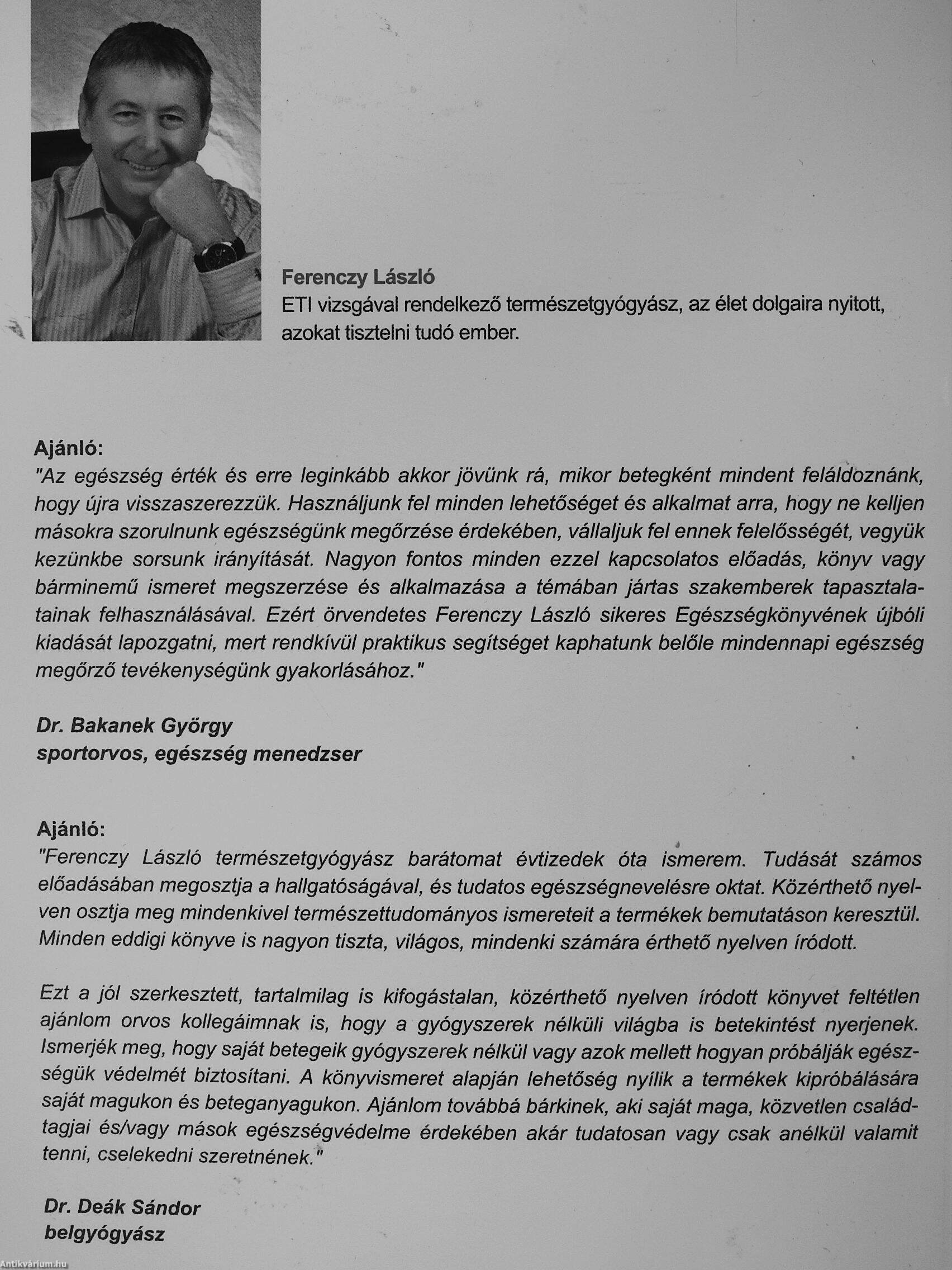 "Ferenczy László természetgyógyász barátomat évtizedek óta ismerem. Tudását számos előadásában megosztja a hallgatóságával, és tudatos egészségnevelésre oktat. Közérthető nyelven osztja meg mindenkivel természettudományos ismereteit a termékek bemutatáson keresztül. Minden eddigi könyve is nagyon tiszta, világos, mindenki számára érthető nyelven íródott.