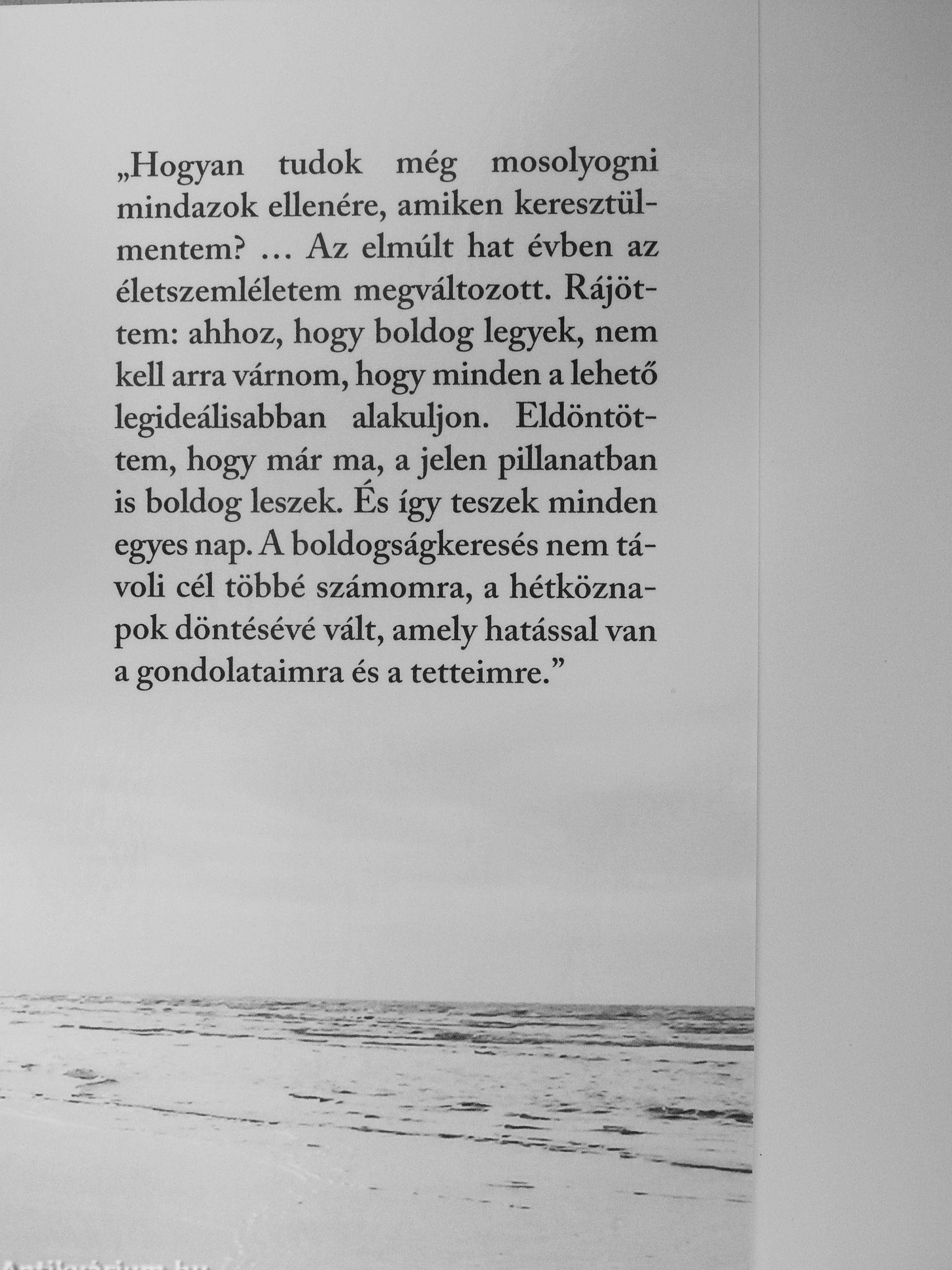 „Hogyan tudok még mosolyogni mindazok ellenére, amiken keresztülmentem? Az elmúlt hat évben az életszemléletem megváltozott. Rájöttem: ahhoz, hogy boldog legyek, nem keU arra várnom, hogy minden a lehető legideálisabban alakuljon. Eldöntöttem, hogy már ma, a jelen pillanatban is boldog leszek. Es így teszek minden egyes nap. A boldogságkeresés nem távoli cél többé számomra, a hétköznapok döntésévé vált, amely hatással van a gondolataimra és a tetteimre."