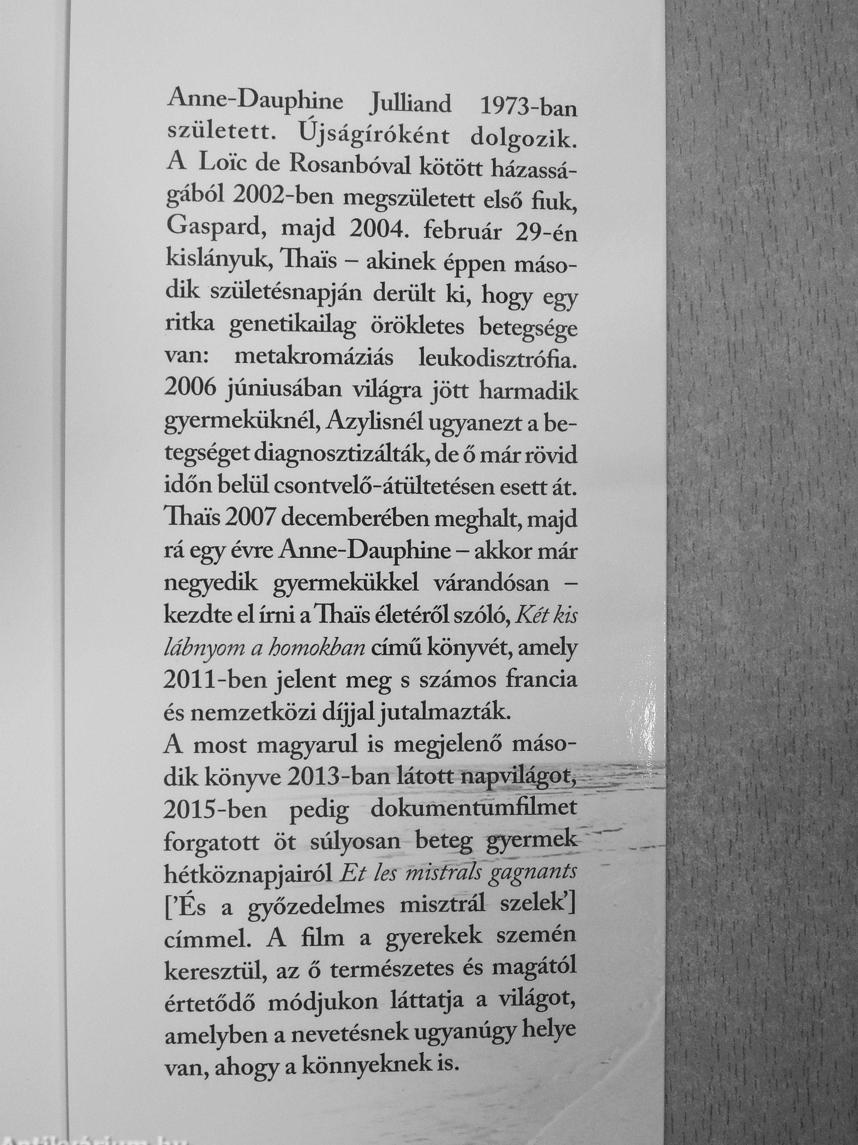 Anne-Dauphine JuUiand 1973-ban született. Újságíróként dolgozik. A Loic de Rosanbóval kötött házasságából 2002-ben megszületett első fiuk, Gaspard, majd 2004. február 29-én kislányuk, Thais - akinek éppen második születésnapján derült ki, hogy egy ritka genetikailag örökletes betegsége van: metakromáziás leukodisztrófia. 2006 júniusában világra jött harmadik gyermeküknél, Azylisnél ugyanezt a betegséget diagnosztizálták, de ő már rövid időn belül csontvelő-átültetésen esett át. Thais 2007 decemberében meghalt, majd rá egy évre Anne-Dauphine - akkor már negyedik gyermekükkel várandósan -kezdte el írni a Thais életéről szóló. Két kis lábnyom a homokban című könyvét, amely 2011-ben jelent meg s számos firancia és nemzetközi díjjal jutalmazták. A most magyarul is megjelenő második könyve 2013-ban látott napvilágot, 20lS-ben pedig dokumentumfilmet forgatott öt súlyosan beteg gyermek hétköznapjairól Et les mistrals gagnants ['Es a győzedelmes misztrál szelek'] címmel. A film a gyerekek szemén keresztül, az ő természetes és magától értetődő módjukon láttatja a vüágot, amelyben a nevetésnek ugyanúgy helye van, ahogy a könnyeknek is.