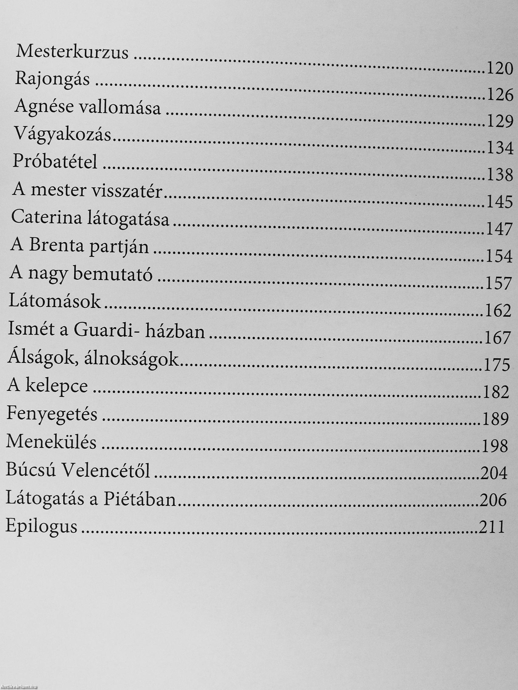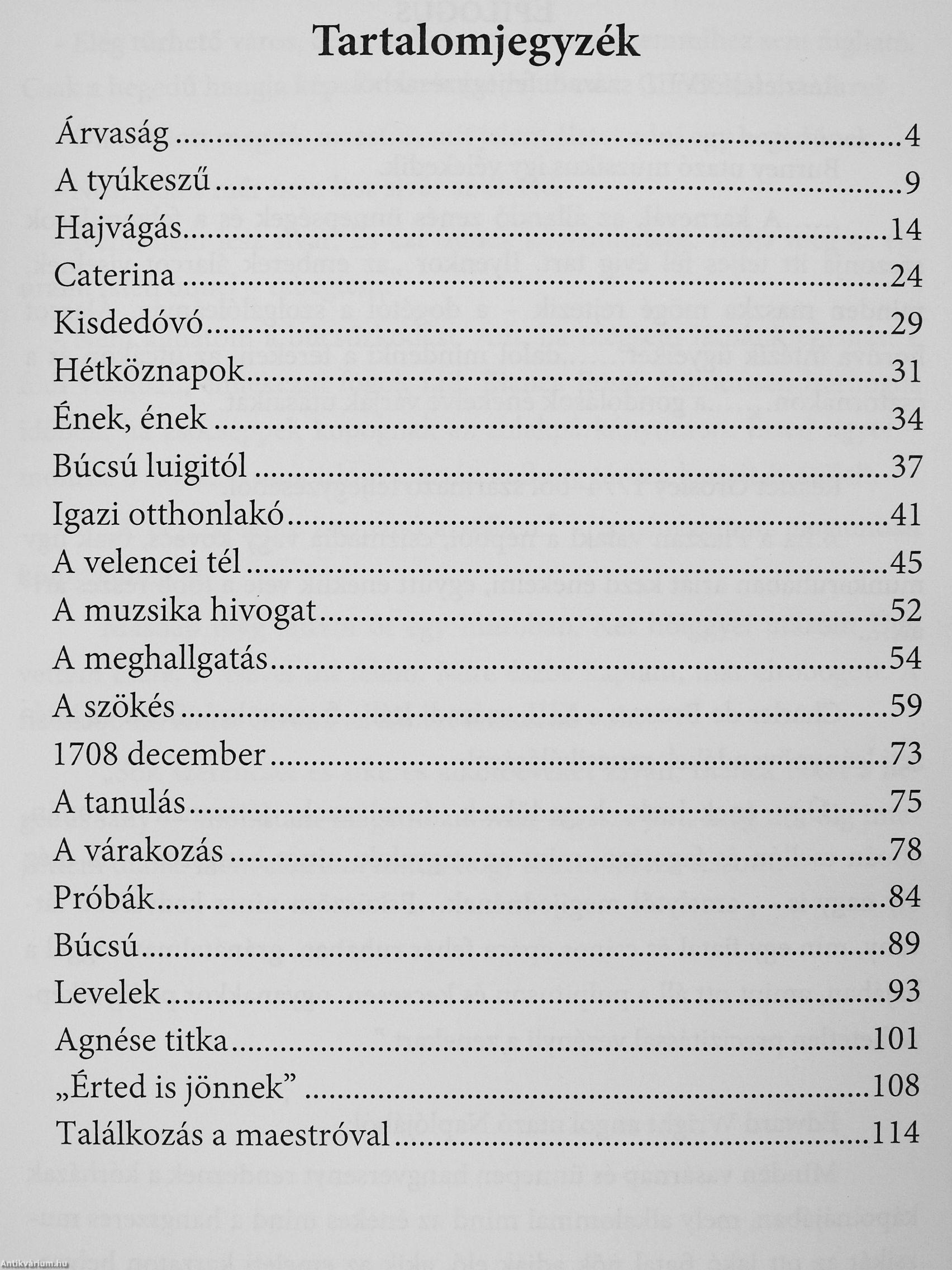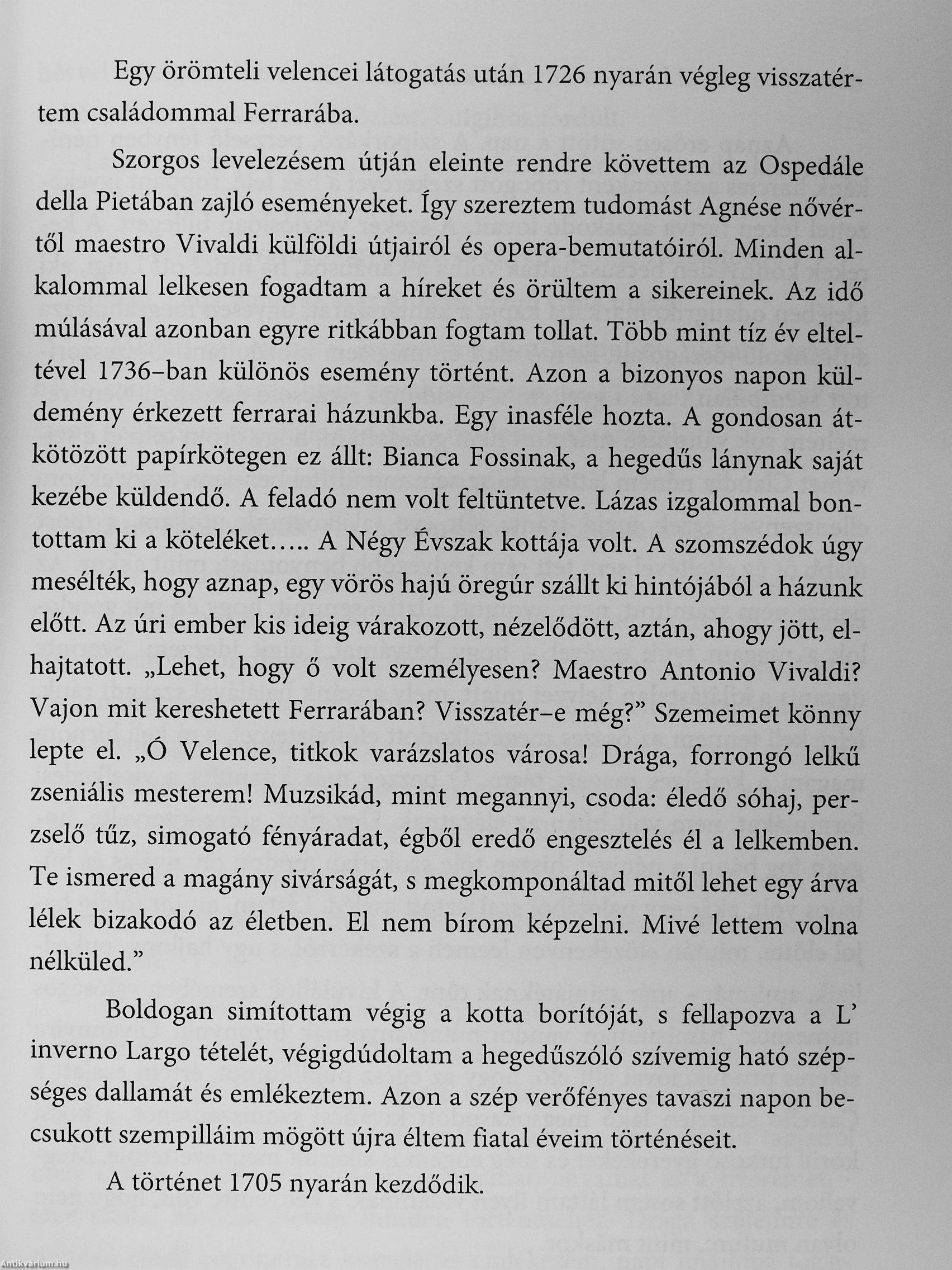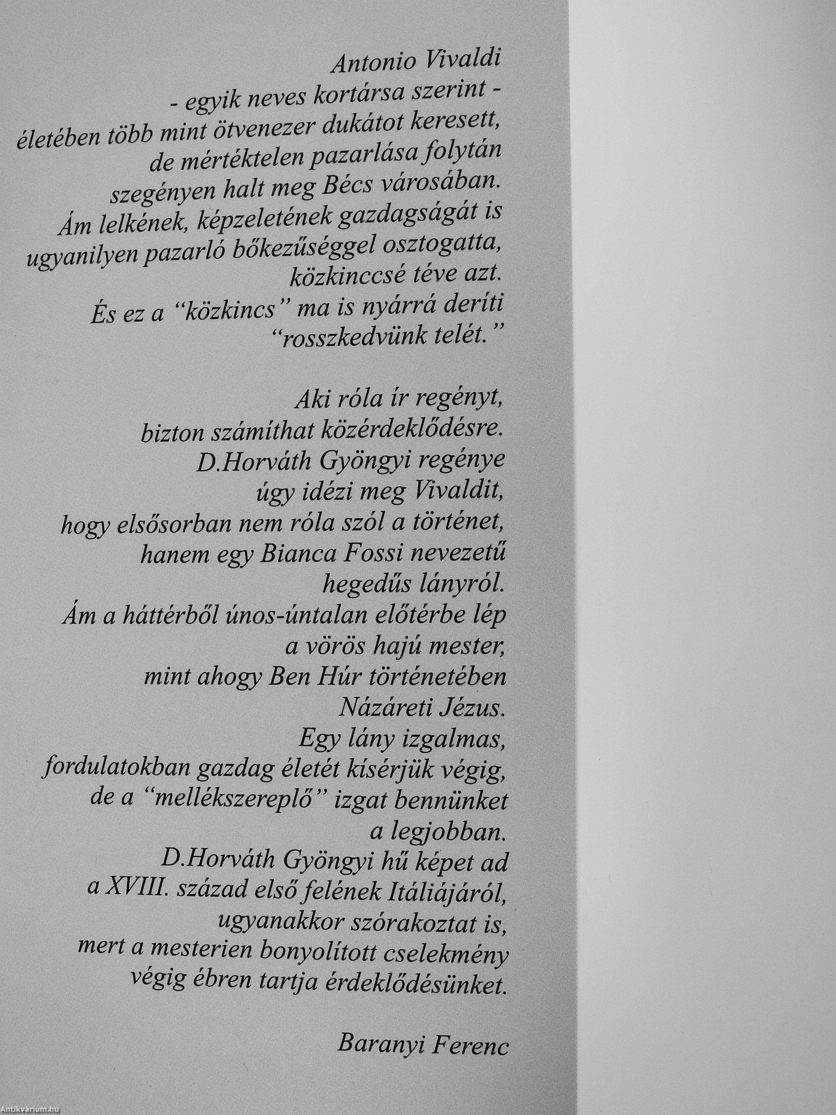 Aki róla ír regényt, bizton számíthat közérdeklődésre. D.Horváth Gyöngyi regénye úgy idézi meg Vivaldit, hogy elsősorban nem róla szól a történet, hanem egy Bianca Fossi nevezetű hegedűs lányról. Ám a háttérből únos-úntalan előtérbe lép a vörös hajú mester, mint ahogy Ben Húr történetében Názáreti Jézus. Egy lány izgalmas, fordulatokban gazdag életét kísérjük végig, de a "mellékszereplő " izgat bennünket a legjobban. D.Horváth Gyöngyi hű képet ad a XVIII. század első felének Itáliájáról, ugyanakkor szórakoztat is, mert a mesterien bonyolított cselekmény végig ébren tartja érdeklődésünket.