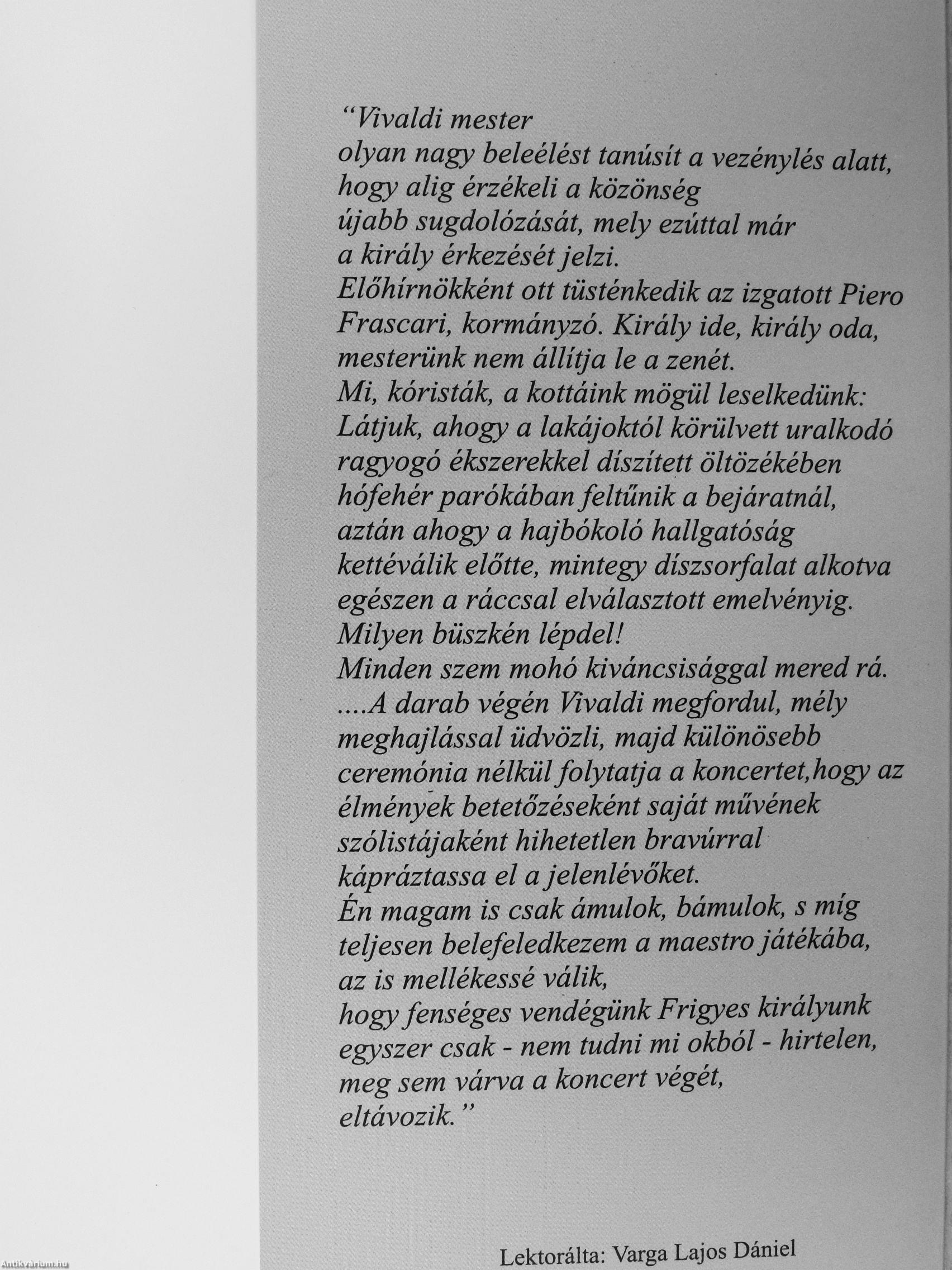 Előhírnökként ott tüsténkedik az izgatott Piero Frascari, kormányzó. Király ide, király oda, mesterünk nem állítja le a zenét. Mi, kóristák, a kottáink mögül leselkedünk: Látjuk, ahogy a lakájoktól körülvett uralkodó ragyogó ékszerekkel díszített öltözékében hófehér parókában feltűnik a bejáratnál, aztán ahogy a hajbókoló hallgatóság kettéválik előtte, mintegy díszsorfalat alkotva egészen a ráccsal elválasztott emelvényig. Milyen büszkén lépdel! Minden szem mohó kíváncsisággal mered rá. A darab végén Vivaldi megfordul, mély meghajlással üdvözli, majd különösebb ceremónia nélkül folytatja a koncertet,hogy az élmények betetőzéseként saját müvének szólistájaként hihetetlen bravúrral kápráztassa el a jelenlévőket. Én magam is csak ámulok, bámulok, s míg teljesen belefeledkezem a maestro játékába, az is mellékessé válik, hogy fenséges vendégünk Frigyes királyunk egyszer csak - nem tudni mi okból - hirtelen, meg sem várva a koncert végét, eltávozik."