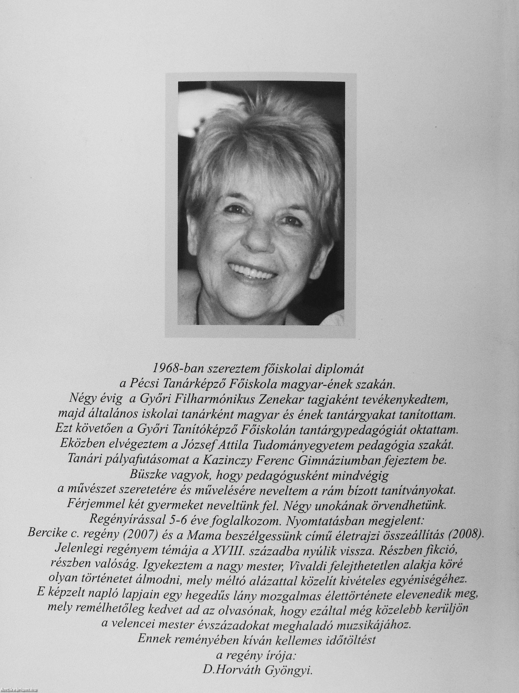 1968-ban szereztem főiskolai diplomát a Pécsi Tanárképző Főiskola magyar-ének szakán. Négy évig a Győri Filharmónikus Zenekar tagjaként tevékenykedtem, majd általános iskolai tanárként magyar és ének tantárgyakat tanítottam. Ezt követően a Győri Tanítóképző Főiskolán tantárgypedagógiát oktattam. Eközben elvégeztem a József Attila Tudományegyetem pedagógia szakát. Tanári pályafutásomat a Kazinczy Ferenc Gimnáziumban fejeztem be. Büszke vagyok, hogy pedagógusként mindvégig a művészet szeretetére és müvelésére neveltem a rám bízott tanítványokat. Férjemmel két gyermeket neveltünk fel. Négy unokának örvendhetünk. Regényírással 5-6 éve foglalkozom. Nyomtatásban megjelent: Bercike c. regény (2007) és a Mama beszélgessünk című életrajzi összeállítás (2008). Jelenlegi regényem témája a XVIII. századba nyúlik vissza. Részben fikció, részben valóság. Igyekeztem a nagy mester, Vivaldi felejthetetlen alakja köré olyan történetet álmodni, mely méltó alázattal közelít kivételes egyéniségéhez. E képzelt napló lapjain egy hegedűs lány mozgalmas élettörténete elevenedik meg, mely remélhetőleg kedvet ad az olvasónak, hogy ezáltal még közelebb kerüljön a velencei mester évszázadokat meghaladó muzsikájához. Ennek reményében kíván kellemes időtöltést a regény írója: D.Horváth Gyöngyi.