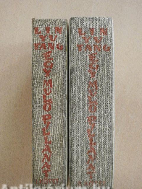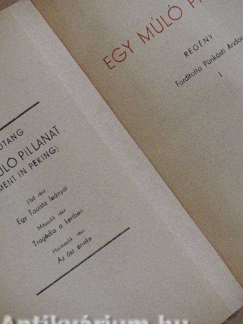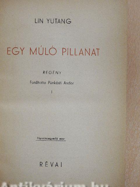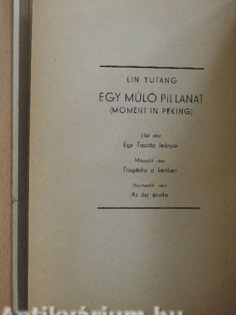 Lin Yutang "Egy múló pillanat"-ja hatalmas, lenyűgöző remekmű. Egy rejtélyes, bonyolult, a miénknél sokkal régibb civilizáció eredeti életformáit rögzíti meg az utolsó pillanatban, amikor emlékük már azokban is ködösülni kezd, akik fiatalkorukban részesei lehettek csodálatos élményanyagának. Kimeríthetetlenül gazdag, szélesen hömpölygő, roppant távlatú mű, művészi és élethű. Egy kultúra, egy nép hanyatlásának roppant körképe. Idő: a század eleje. Látjuk a régi rend utolsó éveit, az angol-szász műveltség lassú beszüremlését, az engedményes területek őrlő munkáját, a régi Kína mandarinvilágának ösztönös ellenszegülését, a másszellemű nemzedékek tragikus összetűzését. Bevezet a regény a kínai társadalomba, megismertet életformáival és szokásaival és különösen izgalmassá, feledhetetlenné teszik elbűvölő, csodálatosan finom szerelmi történetei. A Mennyei Birodalom utolsó boldog évtizedének monumentális regénye, a kritika Tolsztoj "Háború és béké"-jéhez hasonlítja. Amerikában évekig bestseller volt s többmillió példányba fogyott el.