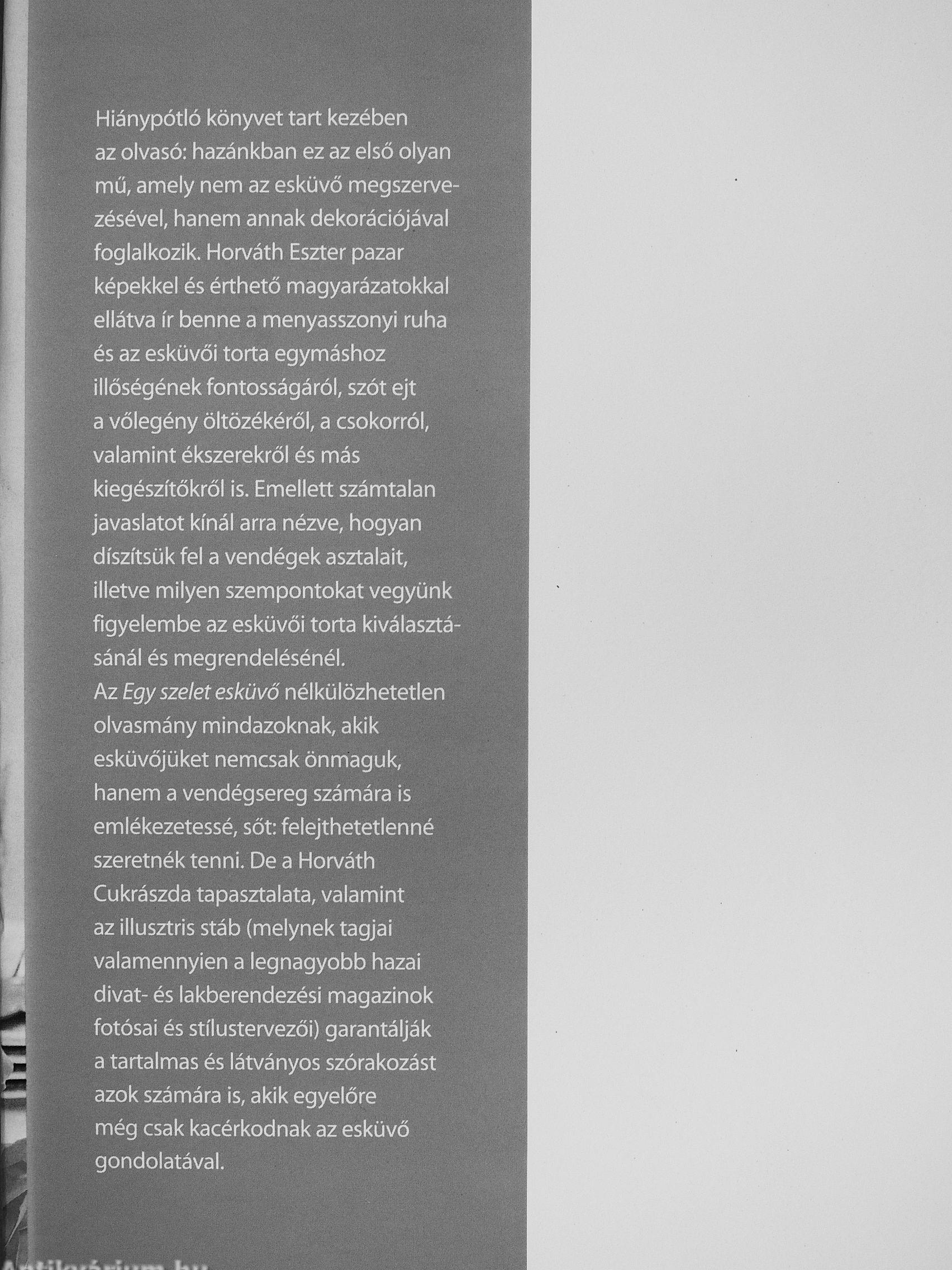 Hiánypótló könyvet tart kezében az olvasó: hazánkban ez az első olyan mű, amely nem az esküvő megszervezésével, hanem annak dekorációjával foglalkozik. Horváth Eszter pazar képekkel és érthető magyarázatokkal ellátva ír benne a menyasszonyi ruha és az esküvői torta egymáshoz illőségének fontosságáról, szót ejt a vőlegény öltözékéről, a csokorról, valamint ékszerekről és más kiegészítőkről is. Emellett számtalan javaslatot kínál arra nézve, hogyan díszítsük fel a vendégek asztalait, illetve milyen szempontokat vegyünk figyelembe az esküvői torta kiválasztásánál és megrendelésénél. Az Egy szelet esküvő nélkülözhetetlen olvasmány mindazoknak, akik esküvőjüket nemcsak önmaguk, hanem a vendégsereg számára is emlékezetessé, sőt: felejthetetlenné szeretnék tenni. De a Horváth Cukrászda tapasztalata, valamint az illusztris stáb (melynek tagjai valamennyien a legnagyobb hazai divat- és lakberendezési magazinok fotósai és stílustervezői) garantálják a tartalmas és látványos szórakozást azok számára is, akik egyelőre még csak kacérkodnak az esküvő gondolatával. Vissza