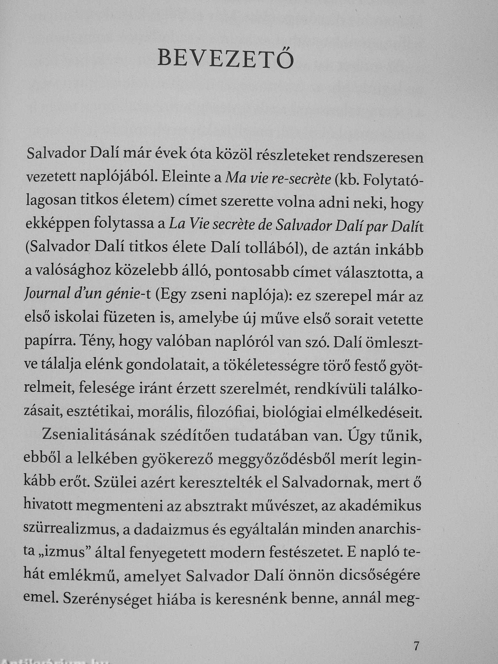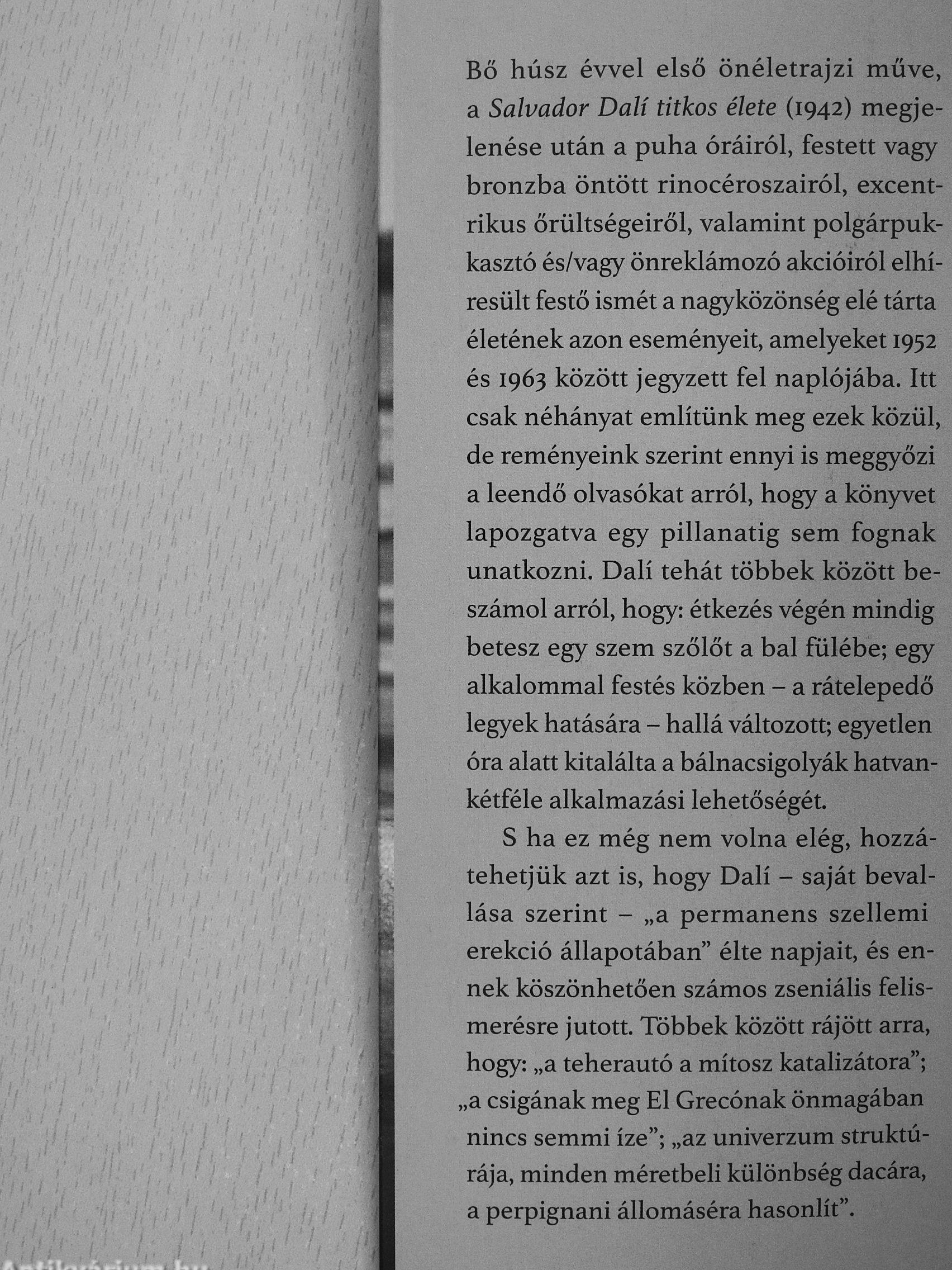 Bő húsz évvel első önéletrajzi műve, a Salvador Dali titkos élete (1942) megjelenése után a puha óráiról, festett vagy bronzba öntött rinocéroszairól, excentrikus őrültségeiről, valamint polgárpukkasztó és/vagy önreklámozó akcióiról elhíresült festő ismét a nagyközönség elé tárta életének azon eseményeit, amelyeket 1952 és 1963 között jegyzett fel naplójába. Itt csak néhányat említünk meg ezek közül, de reményeink szerint ennyi is meggyőzi a leendő olvasókat arról, hogy a könyvet pl lapozgatva egy pillanatig sem fognak I ; unatkozni. Dali tehát többek között be-I számol arról, hogy: étkezés végén mindig