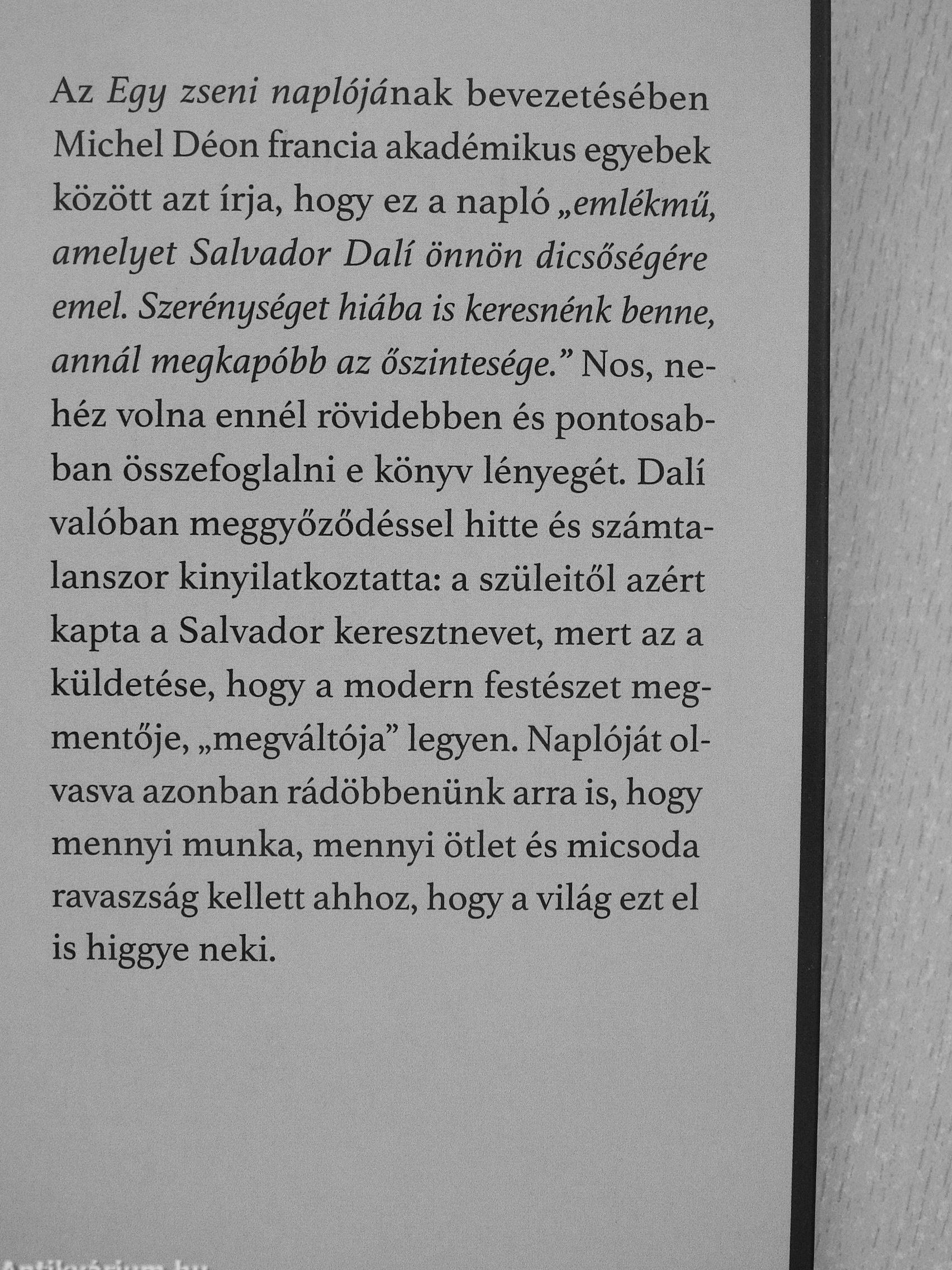 Az Egy zseni naplójának bevezetésében Michel Déon francia akadémikus egyebek között azt írja, hogy ez a napló „emlékmű, amelyet Salvador Dali önnön dicsőségére emel Szerénységet hiába is keresnénk benne, annál megkapóbb az őszintesége" Nos, nehéz volna ennél rövidebben és pontosabban összefoglalni e könyv lényegét. Dali valóban meggyőződéssel hitte és számtalanszor kinyilatkoztatta: a szüleitől azért kapta a Salvador keresztnevet, mert az a küldetése, hogy a modern festészet megmentője, „megváltója" legyen. Naplóját olvasva azonban rádöbbenünk arra is, hogy mennyi munka, mennyi ötlet és micsoda ravaszság kellett ahhoz, hogy a világ ezt el is higgye neki.