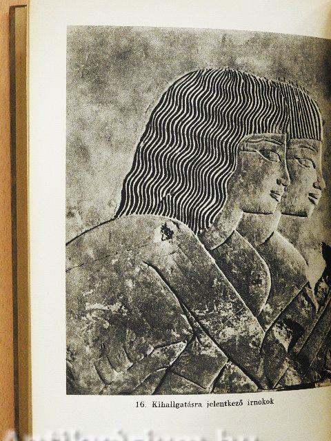 | Kihallgatásra jelentkező irnokok. Dombormű Khaemhet tébai sírjából. XVIII. dinasztia (III. Amenhotep kora). - A túlságosan heves előrehajlás, a puha vonalvezetés, a mell alatti ráncok már az Amarna-művészet közeledésére utalnak. Figyelemreméltó a hátrább fekvő karok merész rövidülése, - de megmarad azért ezeknek a síkba való fordítása is, vö. 5. tábla | |