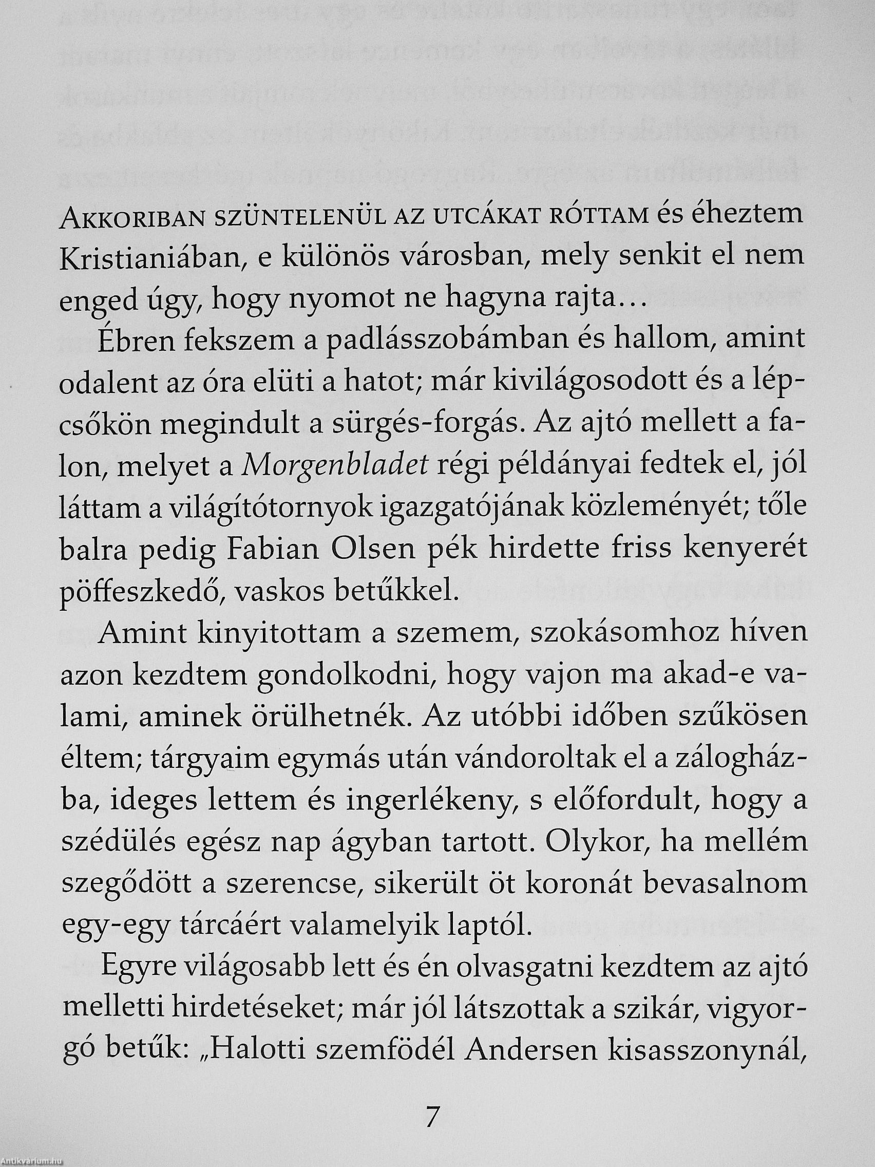 ¦ m cákat járja, az éhség vezeti lépteit, a napok végeérhetetlen labirintusából nincs kiút. Nincs mit ennie, nincs mit felvennie, és nincs hol laknia. Az őrülettői retteg, és az összeomlás szélén áll. De ír. És nem ír. Kószái Kristiániában. Magában beszél. Elriasztja az embereket. Ha pénzhez jut, elajándékozza. Ha szerelmes lesz, megalázzák. Éhezik. A világot átkozza. Túlél. Ir. És végül kihajózik a városból, amely magára hagyta.