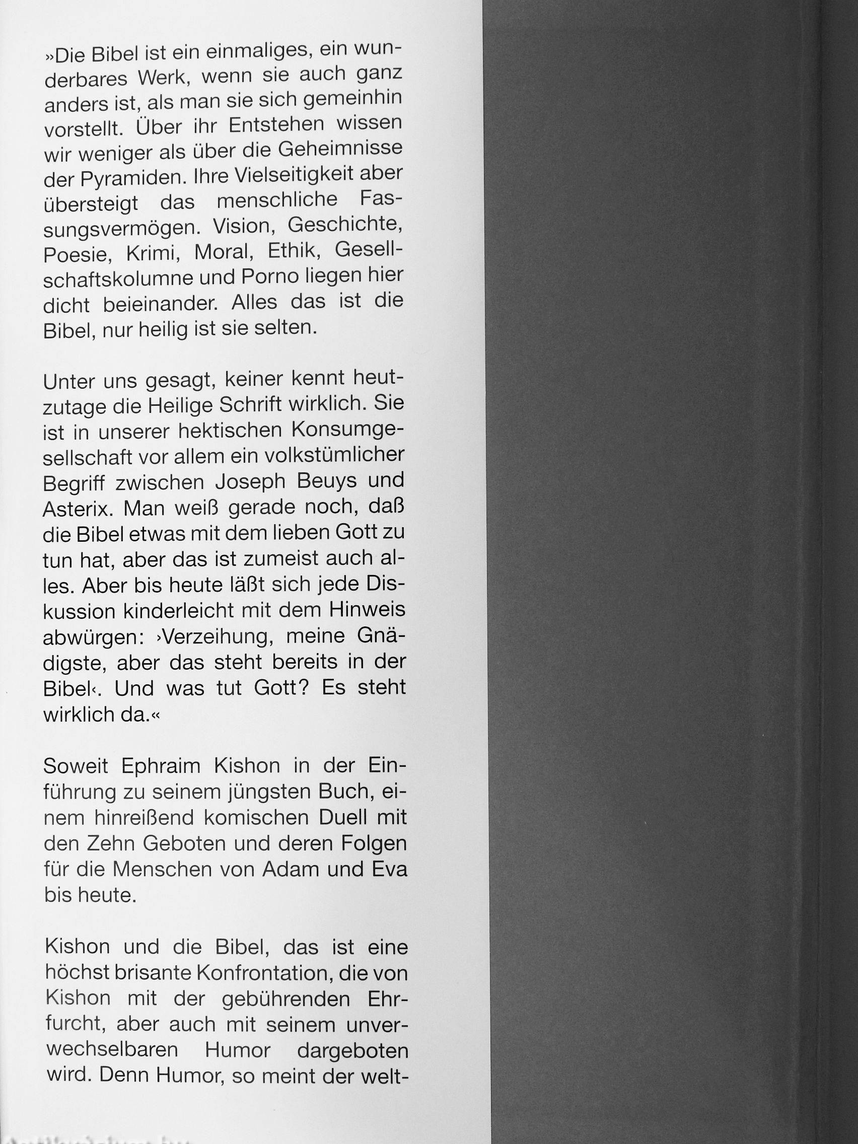 »Die Bibel ist ein einmaliges, ein wunderbares Werk, wenn sie auch ganz anders ist, als man sie sich gemeinhin vorstellt. Über ihr Entstehen wissen wir weniger als über die Geheimnisse der Pyramiden. Ihre Vielseitigkeit aber übersteigt das menschliche Fassungsvermögen. Vision, Geschichte, Poesie, Krimi, Moral, Ethik, Gesellschaftskolumne und Porno liegen hier dicht beieinander. Alles das ist die Bibel, nur heilig ist sie selten.