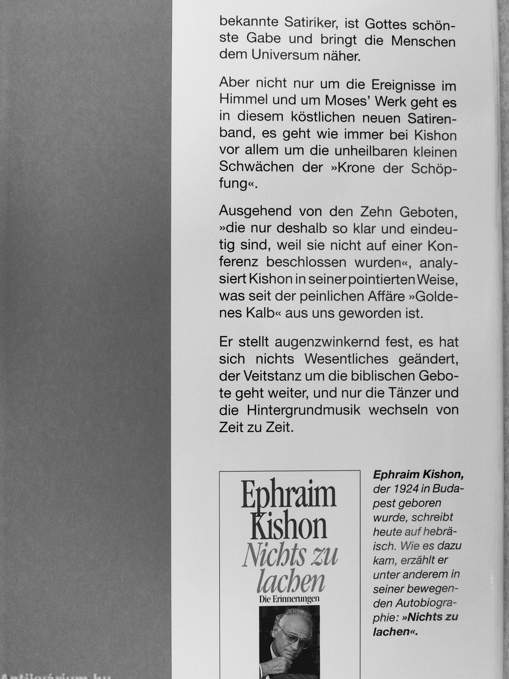 Ephraim Kishons neues Buch ist eine mit brillantem Humor geführte Auseinandersetzung mit all den Fragen, die sich der Menschheit stellen, seit Eva ihren Adam in den Apfel beißen ließ und seit Moses die Zehn Gebote von dem Allmächtigen empfing.