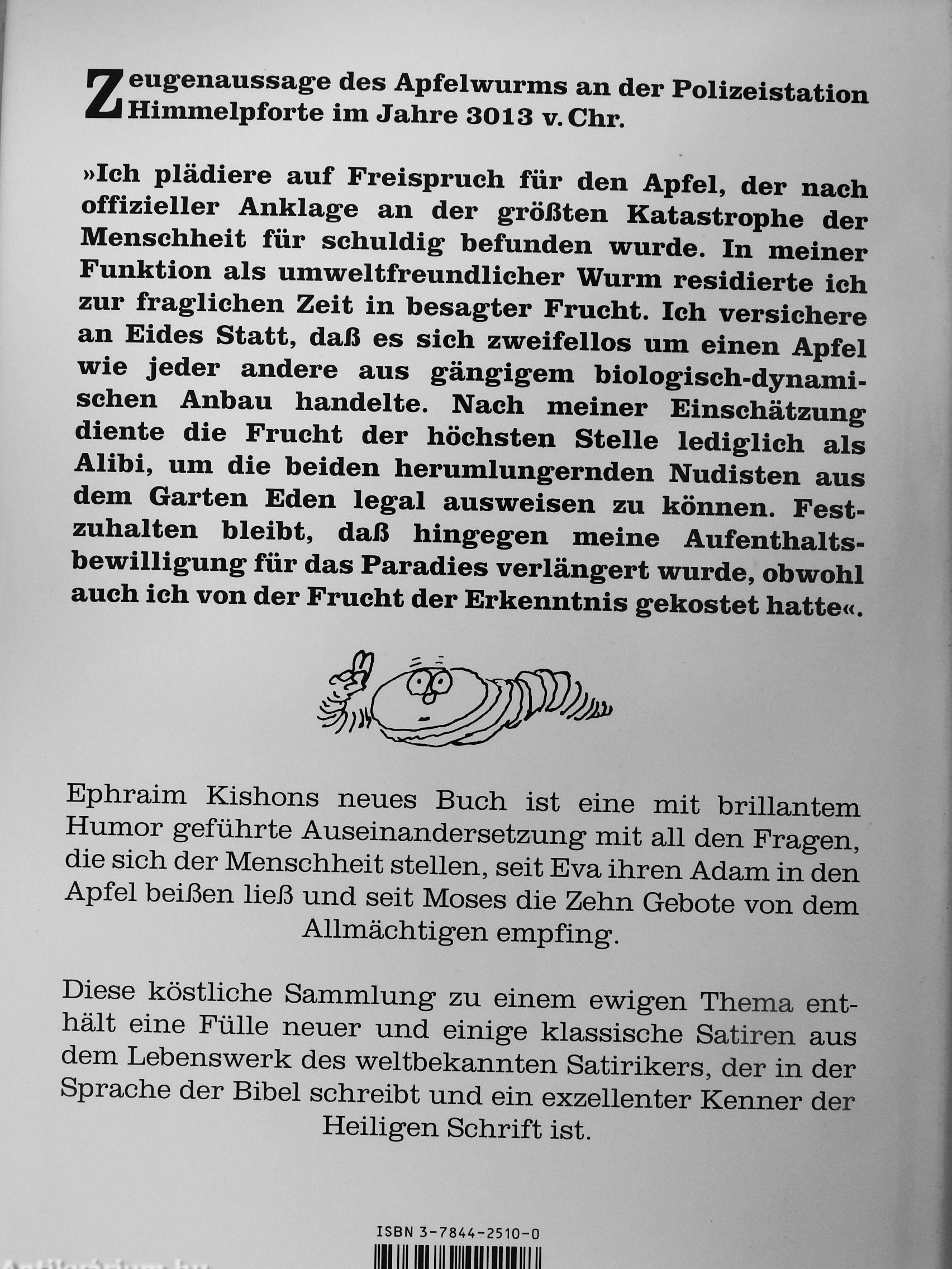 »Ich plädiere auf Freispruch für den Apfel, der nach offizieller Anklage an der größten Katastrophe der Menschheit für schuldig befunden wurde. In meiner Funktion als umweltfreundlicher Wurm residierte ich zur fraglichen Zeit in besagter Frucht. Ich versichere an Eides Statt, daß es sich zweifellos um einen Apfel wie jeder andere aus gängigem biologisch-dynami-schen Anbau handelte. Nach meiner Einschätzung diente die Frucht der höchsten Stelle lediglich als Alibi, um die beiden herumlungernden Nudisten aus dem Garten Eden legal ausweisen zu können. Festzuhalten bleibt, daß hingegen meine Aufenthaltsbewilligung für das Paradies verlängert wurde, obwohl auch ich von der Frucht der Erkenntnis gekostet hatte«.