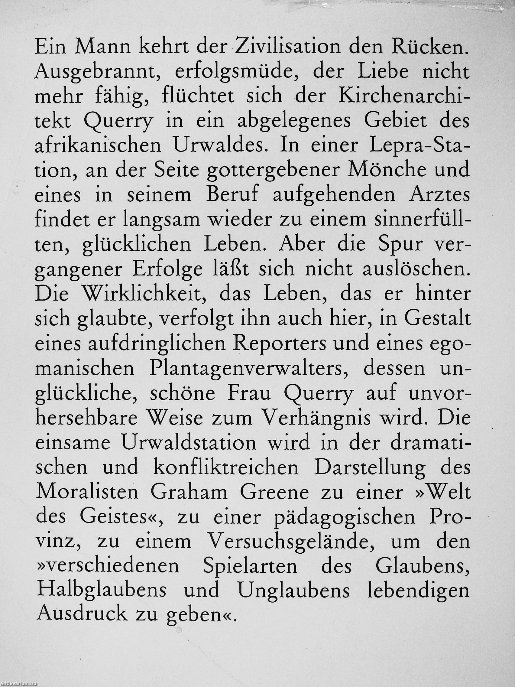 Ein Mann kehrt der Zivihsation den Rücken. Ausgebrannt, erfolgsmüde, der Liebe nicht mehr fähig, flüchtet sich der Kirchenarchitekt Querry in ein abgelegenes Gebiet des afrikanischen Urwaldes. In einer Lepra-Sta-tion, an der Seite gottergebener Mönche und eines in seinem Beruf aufgehenden Arztes findet er langsam wieder zu einem sinnerfüllten, glücklichen Leben. Aber die Spur vergangener Erfolge läßt sich nicht auslöschen. Die Wirklichkeit, das Leben, das er hinter sich glaubte, verfolgt ihn auch hier, in Gestalt eines aufdringlichen Reporters und eines egomanischen Plantagenverwalters, dessen unglückliche, schöne Frau Querry auf unvor-lersehbare Weise zum Verhängnis wird. Die einsame Urwaldstation wird in der dramatischen und konfliktreichen Darstellung des Moralisten Graham Greene zu einer »Welt des Geistes«, zu einer pädagogischen Provinz, zu einem Versuchsgelände, um den »verschiedenen Spielarten des Glaubens, Halbglaubens und Unglaubens lebendigen Ausdruck zu geben«.